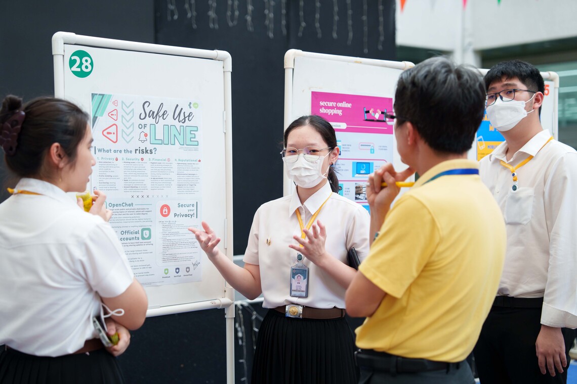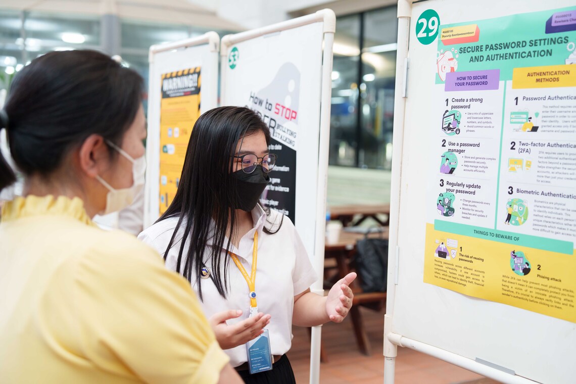 วันที่ 29 เมษายน 2567 คณะเทคโนโลยีสารสนเทศและการสื่อสาร มหาวิทยาลัยมหิดล (ICT Mahidol) นำโดย รศ.ดร. วัสกา วิสุทธิวิเศษ ผศ.ดร. ชาญยศ ปลื้มปิติวิริยะเวช และ อาจารย์ ผกาพร เพ็งศาสตร์ อาจารย์ประจำรายวิชา ทสศท 182 การตระหนักรู้ความมั่นคงทางไซเบอร์ (ITGE182 Cybersecurity Awareness) จัดกิจกรรม “นำเสนอโครงงานรายวิชา ITGE182 Cybersecurity Awareness” ในรูปแบบ Mini Poster ให้แก่นักศึกษาชั้นปีที่ 1 สาขาวิชาเทคโนโลยีสารสนเทศและการสื่อสาร (ICT หลักสูตรนานาชาติ) โดยมีวัตถุประสงค์เพื่อให้นักศึกษาได้แสดงหลักการและเหตุผลในการจัดทำโครงงานของตนเอง แก่อาจารย์ประจำรายวิชา ณ ลาน Innovative Space ชั้น 1 คณะ ICT มหาวิทยาลัยมหิดล ศาลายา
