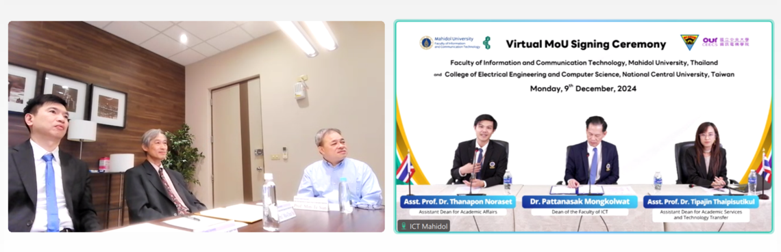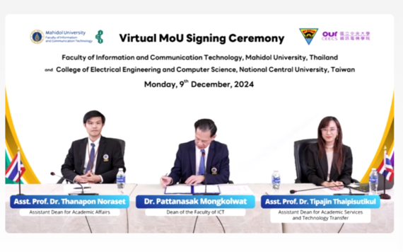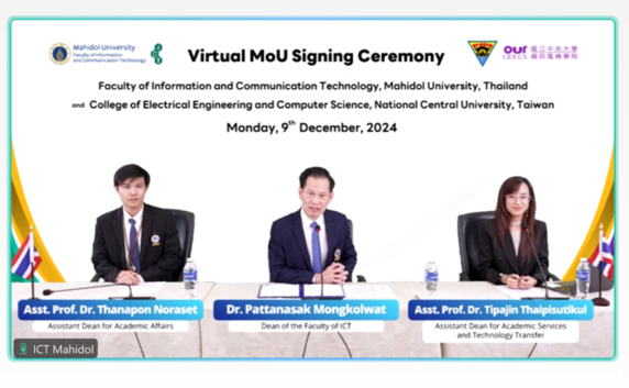 วันที่ 9 ธันวาคม 2567 ดร.พัฒนศักดิ์ มงคลวัฒน์ คณบดี คณะเทคโนโลยีสารสนเทศและการสื่อสาร มหาวิทยาลัยมหิดล (ICT Mahidol) ร่วมลงนามบันทึกข้อตกลงความร่วมมือทางวิชาการ (MoU) กับ Prof. Mu-Chun Su, Dean of College of Electrical Engineering & Computer Science, National Central University สาธารณรัฐจีน (ไต้หวัน) โดยมี ผศ. ดร.ธนพล นรเสฏฐ์ ผู้ช่วยคณบดีฝ่ายการศึกษา ผศ. ดร.ทิพาจินต์ ไทยพิสุทธิกุล ผู้ช่วยคณบดีฝ่ายบริการวิชาการและถ่ายทอดเทคโนโลยี พร้อมด้วย Prof. Po-Lei Lee, Associate Dean of College of Electrical Engineering & Computer Science และ Prof. Min-Te Sun, Chair of the Department of Computer Science & Information Engineering จาก National Central University สาธารณรัฐจีน (ไต้หวัน) ร่วมเป็นสักขีพยาน ณ ห้อง IT406 ชั้น 4 คณะ ICT มหาวิทยาลัยมหิดล ศาลายา และในรูปแบบออนไลน์ผ่านโปรแกรม Webex Meetings