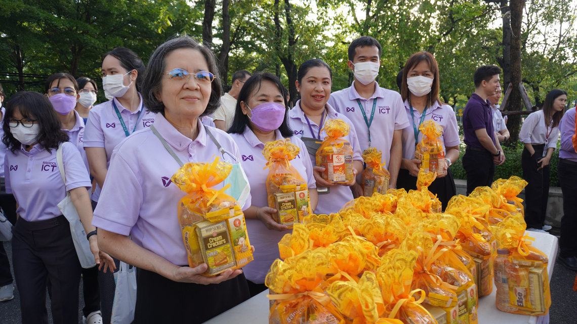 วันที่ 31 พฤษภาคม 2567 ผศ.ดร. สุกัญญา พงษ์สุภาพ รองคณบดีฝ่ายกลยุทธ์และประกันคุณภาพ คณะเทคโนโลยีสารสนเทศและการสื่อสาร (ICT Mahidol) มหาวิทยาลัยมหิดล เป็นผู้แทนคณบดี พร้อมด้วยคณะผู้บริหาร คณาจารย์ และบุคลากร เข้าร่วมพิธีทำบุญตักบาตร พระภิกษุสงฆ์จำนวน 30 รูป เนื่องในวันเฉลิมพระชนมพรรษา สมเด็จพระนางเจ้าสุทิดา พัชรสุธาพิมลลักษณ พระบรมราชินี 46 พรรษา 3 มิถุนายน 2567 ณ บริเวณด้านหน้าสำนักงานอธิการบดี มหาวิทยาลัยมหิดล ศาลายา จากนั้น ผศ.ดร. สุกัญญา พงษ์สุภาพ ได้เข้าร่วมพิธีถวายราชสดุดีเฉลิมพระเกียรติ และพิธีถวายพระชัยมงคล โดยมีศาสตราจารย์ นายแพทย์บรรจง มไหสวริยะ อธิการบดี มหาวิทยาลัยมหิดล ให้เกียรติเป็นประธานในพิธีฯ และลงนามถวายพระพร ถวายมาลัย ถวายพานพุ่มราชสักการะ จุดเทียนชัยถวายพระพร เปิดกรวยกระทงดอกไม้ กล่าวถวายราชสดุดีเฉลิมพระเกียรติ ถวายพระพรชัยมงคล และในลำดับสุดท้าย ผู้ร่วมพิธีฯ ร่วมร้องเพลงสรรเสริญพระบารมีเพลงสดุดีจอมราชา และ ถวายความเคารพพระบรมฉายาลักษณ์ ณ บริเวณโถงด้านในอาคารสำนักงานอธิการบดี