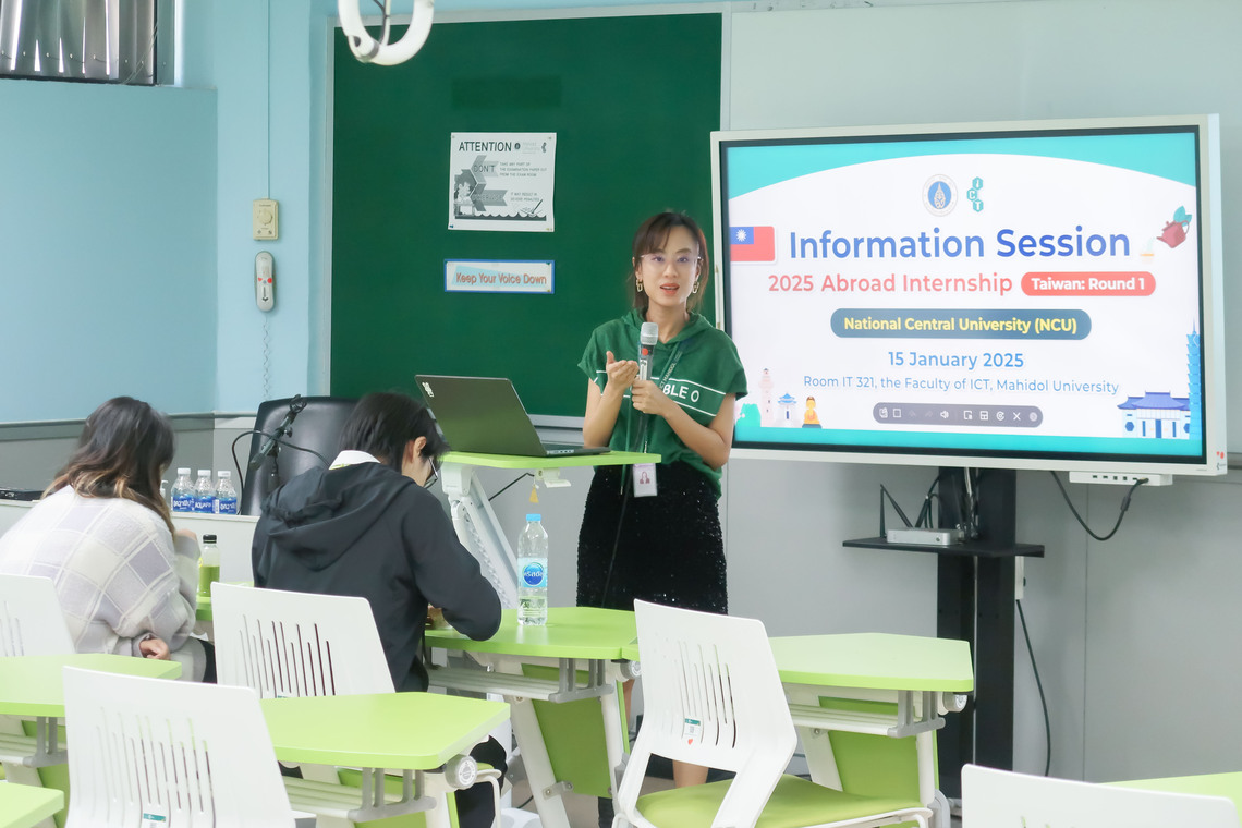 วันที่ 15 มกราคม 2568 คณะเทคโนโลยีสารสนเทศและการสื่อสาร มหาวิทยาลัยมหิดล (ICT Mahidol) จัดกิจกรรม “Information Session for 2025 Internships Abroad” ณ สาธารณรัฐจีน (ไต้หวัน) และ สหพันธ์สาธารณรัฐเยอรมนี เพื่อแนะนำข้อมูลโครงการแลกเปลี่ยนนักศึกษา และภาพรวมของการฝึกงานด้าน ICT ในต่างประเทศ พร้อมชี้แจงรายละเอียดเกี่ยวกับเกณฑ์การสมัคร ให้แก่นักศึกษาหลักสูตรวิทยาศาสตรบัณฑิต สาขาวิชาเทคโนโลยีสารสนเทศและการสื่อสาร (ICT หลักสูตรนานาชาติ) จำนวน 45 คน ณ ห้อง IT321 ชั้น 3 คณะ ICT มหาวิทยาลัยมหิดล ศาลายา ดังนี้