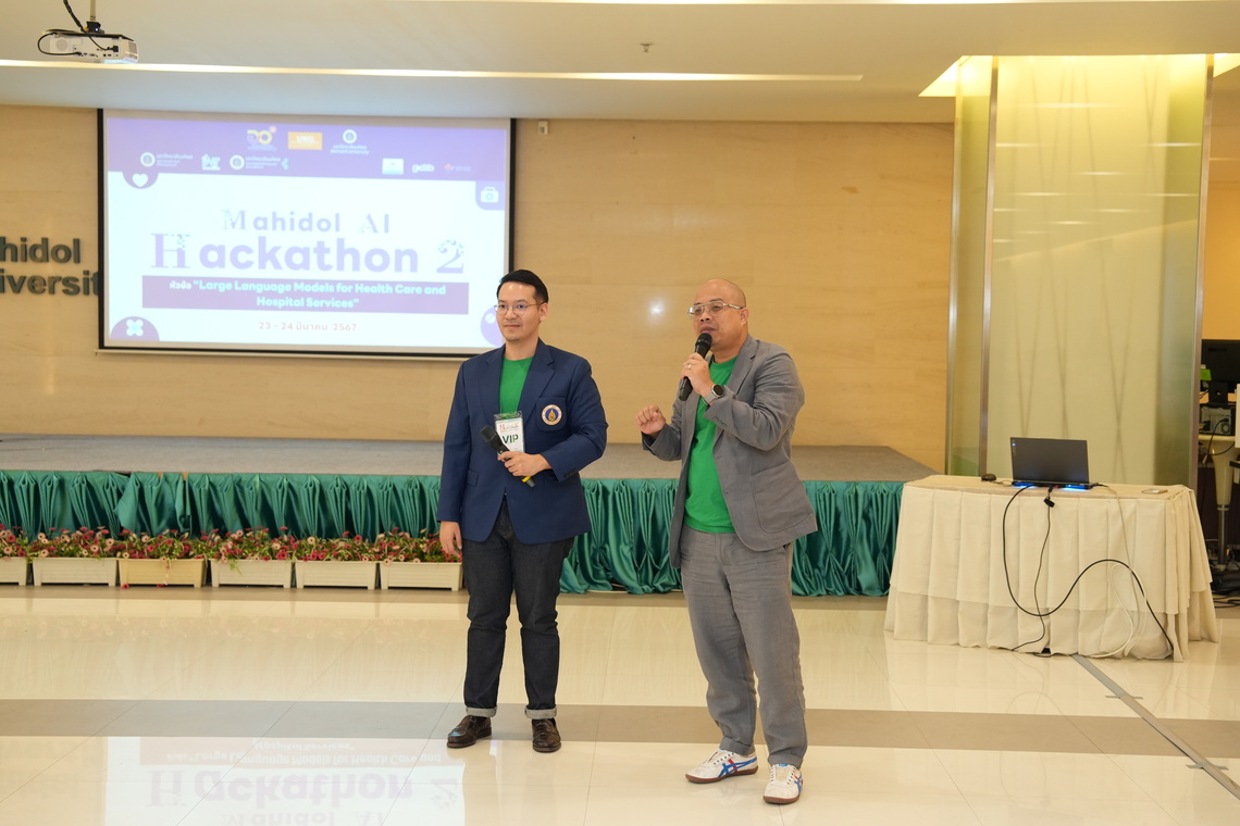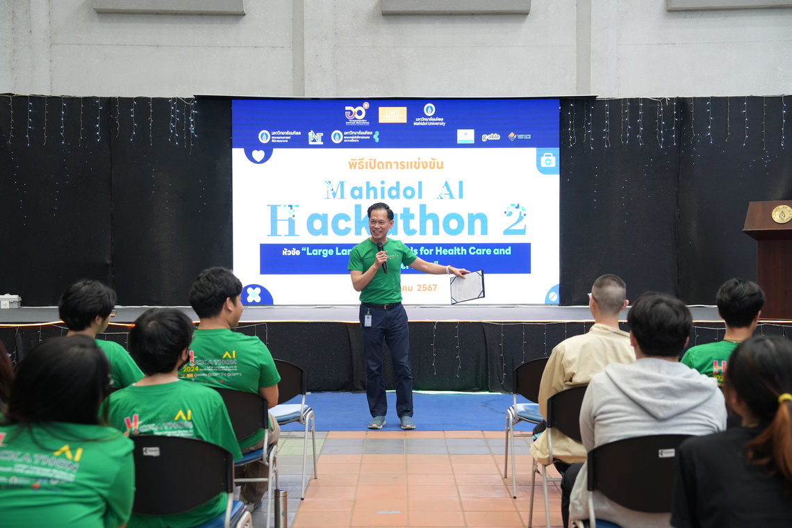 โดยวันที่ 24 มีนาคม 2567 ดร. พัฒนศักดิ์ มงคลวัฒน์ คณบดี คณะเทคโนโลยีสารสนเทศและการสื่อสาร มหาวิทยาลัยมหิดล (ICT Mahidol) เป็นประธานในพิธีเปิดโครงการแข่งขัน Mahidol AI Hackathon 2 หัวข้อ “Large Language Models for Health Care and Hospital Services” โดยได้รับเกียรติจาก ผู้ช่วยศาสตราจารย์ ดร. ประพัฒน์ สุริยผล รองคณบดีฝ่ายสารสนเทศ คณะแพทยศาสตร์ศิริราชพยาบาล รองศาสตราจารย์ ดร.ยศชนัน วงศ์สวัสดิ์ ผู้อำนวยการสถาบันบริหารจัดการเทคโนโลยีและนวัตกรรม (iNT) มหาวิทยาลัยมหิดล และ คุณพัฒนพรรณ พัฒนแก้ว กรรมการผู้จัดการ บริษัท เทเลเทค โซลูชั่น จำกัด ผู้แทนจาก Alcatel-Lucent Enterprise กล่าวต้อนรับคณะผู้บริหาร คณาจารย์ ผู้แทนจากบริษัทต่างๆ ที่ร่วมสนับสนุนการแข่งขัน ได้แก่ บริษัท วีเอสที อีซีเอส (ประเทศไทย) บริษัท จีเอเบิล จำกัด และนักศึกษาจากส่วนงานต่างๆ ในมหาวิทยาลัยมหิดลที่เข้าร่วมการแข่งขัน จำนวน 16 ทีม จาก 6 คณะ ได้แก่ คณะ ICT คณะวิศวกรรมศาสตร์ คณะแพทยศาสตร์โรงพยาบาลรามาธิบดี คณะพยาบาลศาสตร์ คณะวิทยาศาสตร์ และวิทยาลัยนานาชาติ โดยมี อาจารย์ผกาพร เพ็งศาสตร์ รองคณบดีฝ่ายโครงสร้างพื้นฐานและเทคโนโลยี กล่าวรายงานวัตถุประสงค์การจัดโครงการฯ และ ดร. ทิพาจินต์ ไทยพิสุทธิกุล ผู้ช่วยคณบดีฝ่ายบริการวิชาการและถ่ายทอดเทคโนโลยี เป็นพิธีกรดำเนินรายการ ณ ลาน Innovative Space ชั้น 1 คณะ ICT มหาวิทยาลัยมหิดล ศาลายา