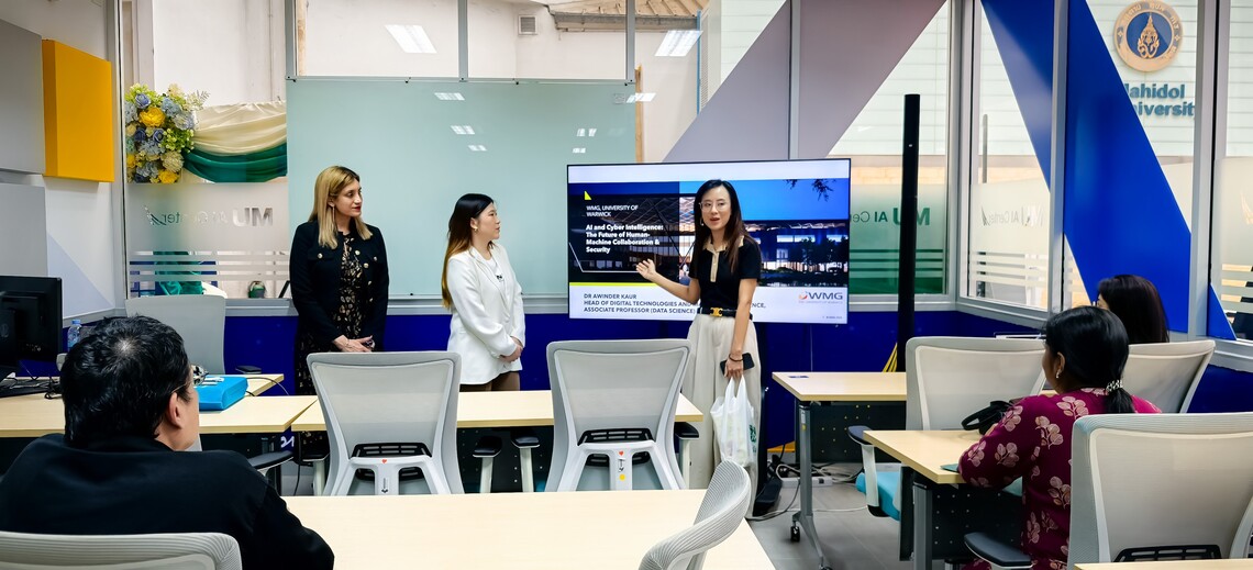 วันที่ 21 เมษายน 2568 คณะเทคโนโลยีสารสนเทศและการสื่อสาร มหาวิทยาลัยมหิดล (ICT Mahidol) ร่วมกับ University of Warwick สหราชอาณาจักร จัดโครงการสัมมนาวิชาการ “AI & Cyber Intelligence: The Future of Human-Machine Collaboration & Security” โดยได้รับเกียรติจาก ผศ.ดร. ทิพาจินต์ ไทยพิสุทธิกุล ผู้ช่วยคณบดีฝ่ายบริการวิชาการและถ่ายทอดเทคโนโลยี เป็นผู้กล่าวเปิดโครงการฯ พร้อมด้วย Dr. Awinder Kaur, Head of Digital Technologies and Machine intelligence เป็นวิทยากรถ่ายทอดองค์ความรู้เกี่ยวกับการทำงานร่วมกันระหว่างมนุษย์และเครื่องจักรโดยใช้เทคโนโลยีปัญญาประดิษฐ์ (Artificial Intelligence (AI)) และข่าวกรองทางไซเบอร์ (Cyber Intelligence) ให้แก่คณาจารย์ บุคลากร นักศึกษามหาวิทยาลัยมหิดล และผู้สนใจ ณ ห้อง A2 ชั้น 1 คณะ ICT มหาวิทยาลัยมหิดล ศาลายา