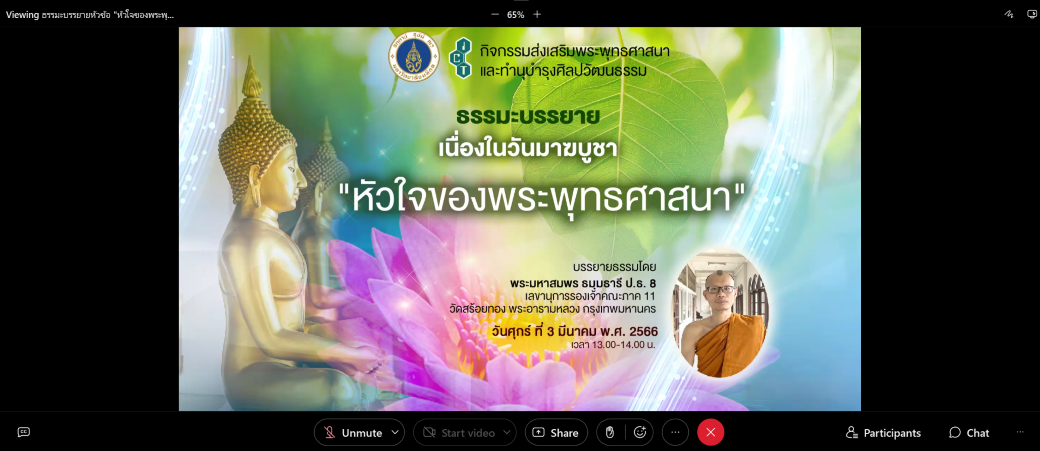 On March 3, 2023 – the Faculty of Information and Communication Technology, Mahidol University (ICT Mahidol), organized an online “Dhamma Listening: Heart of Buddhism”, on the occasion of Makha Bucha Day via Webex Meetings. The session was led by Phra Maha Somporn Thammatharee, the Secretary of the Chief Monk of the 11th region, and the 8th Grade Buddhist Theology Achiever, Wat Soi Thong Phra Aram Luang, Bangkok. The session was attended by numerous faculty members and staff.