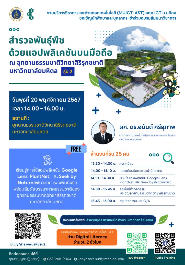 วันพุธที่ 20 พฤศจิกายน 2567 เวลา 14.00 – 16.00 น. อุทยานธรรมชาติวิทยาสิรีรุกขชาติ มหาวิทยาลัยมหิดล