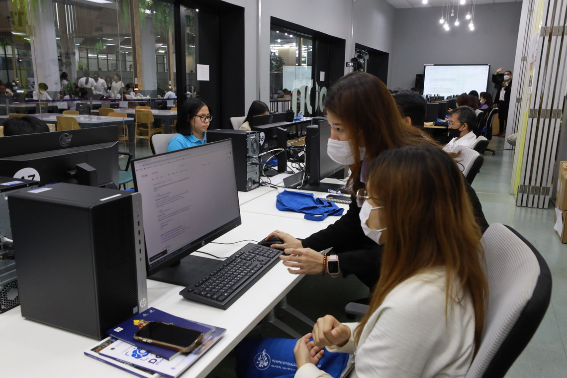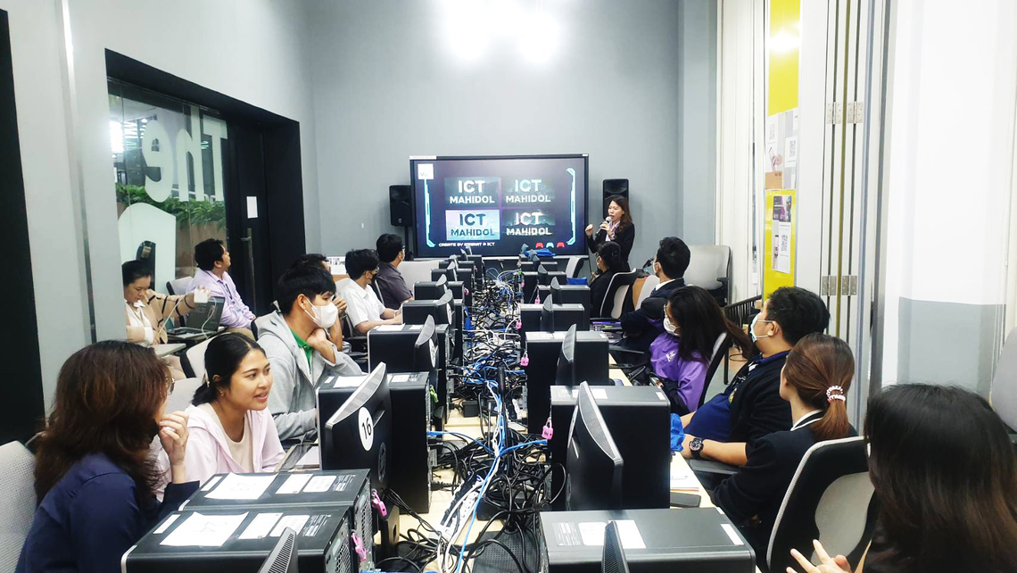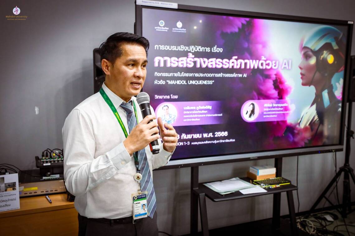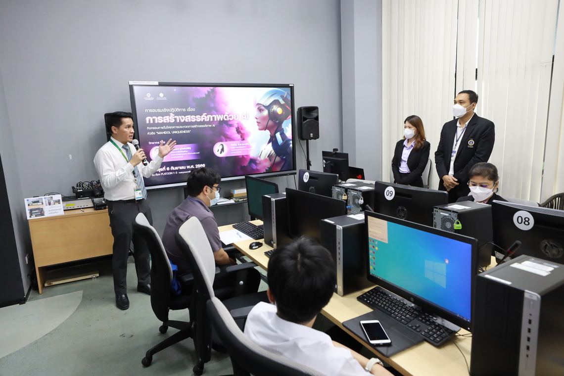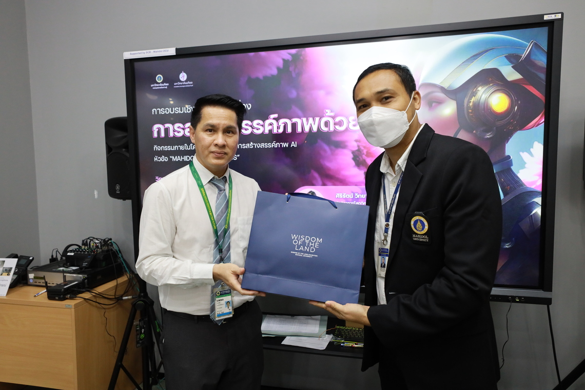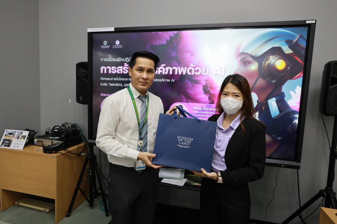 On September 6, 2023 – Miss Sirirat Wittayakunsatid, Audio-Visual Technical Officer from Audio Visual and Digital Learning Media Development Department, the Faculty of Information and Communication Technology, as well as Mr. Chalermpol Phuwatadisit from Division of Information Technology (MUIT), Office of the President, Mahidol University, served as guest speakers on the topic of “Creating Art with AI” for the students and staff of Mahidol University. The event took place in Platoon 1-3 Room, Mahidol University Library and Knowledge Center, Mahidol University, Salaya.
