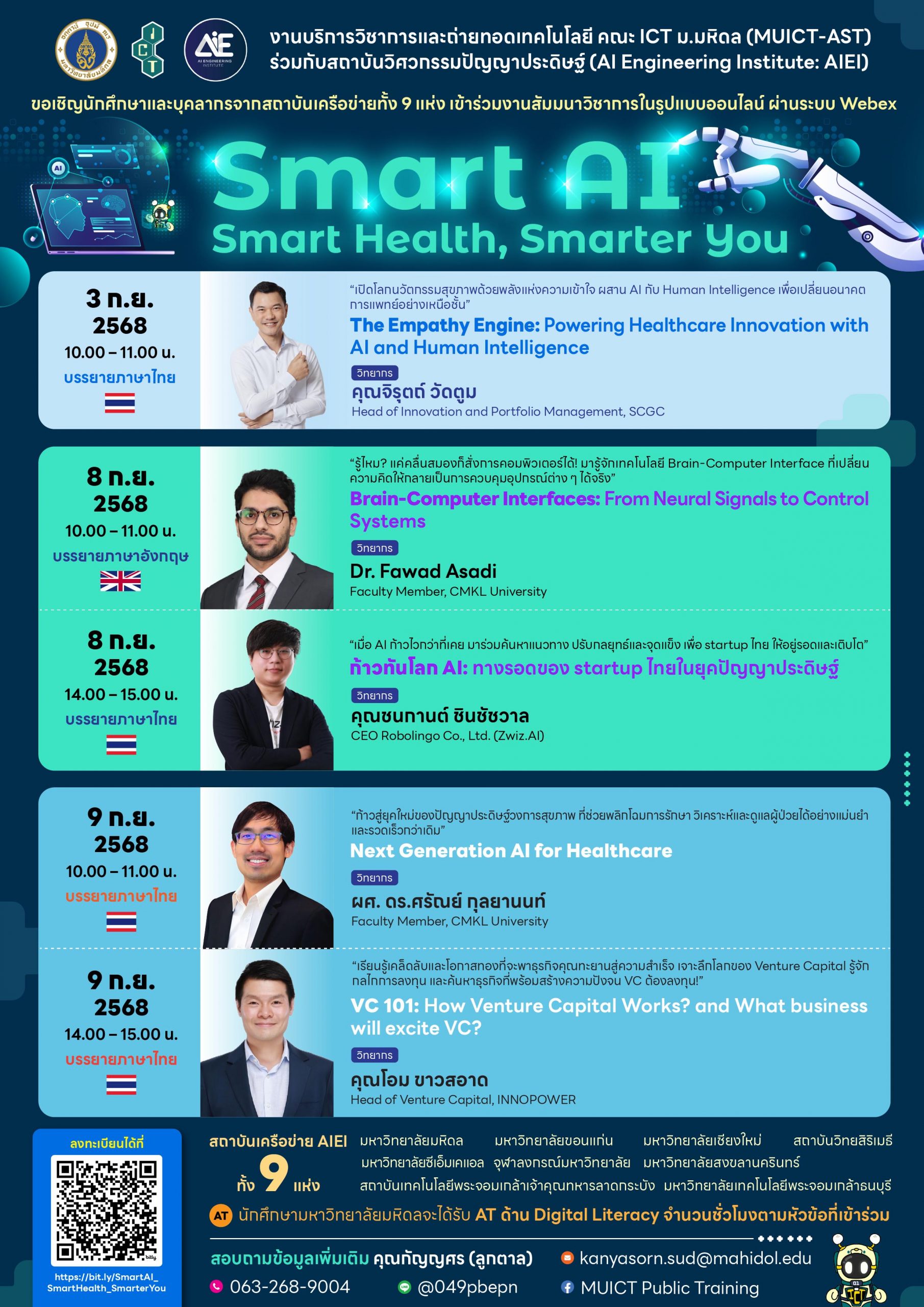 ในปัจจุบัน เทคโนโลยีปัญญาประดิษฐ์ (Artificial Intelligence: AI) ได้กลายเป็นเครื่องมือสำคัญในการยกระดับการให้บริการสุขภาพและการแพทย์ของประเทศทั่วโลก AI มีบทบาทในการวินิจฉัยโรคจากภาพทางการแพทย์ การคาดการณ์อาการของผู้ป่วย การสนับสนุนการตัดสินใจทางคลินิก (Clinical Decision Support System) ตลอดจนการจัดการข้อมูลสุขภาพขนาดใหญ่ (Big Data) เพื่อสร้างระบบบริการที่แม่นยำ รวดเร็ว และเข้าถึงได้มากยิ่งขึ้น โดยเฉพาะอย่างยิ่งในประเทศไทยที่กำลังเผชิญความท้าทายจาก สังคมสูงวัย, ภาวะโรคเรื้อรัง, และ ความเหลื่อมล้ำในการเข้าถึงบริการสุขภาพ เทคโนโลยี AI จึงเป็นโอกาสสำคัญที่จะเสริมศักยภาพระบบสาธารณสุขไทยอย่างยั่งยืน เพื่อให้การพัฒนานี้เกิดขึ้นได้จริง จำเป็นต้องมีการ บ่มเพาะบุคลากรด้าน AI ที่เข้าใจระบบสุขภาพอย่างลึกซึ้ง รวมถึงเปิดพื้นที่สำหรับการสร้างนวัตกรรมที่เชื่อมโยงองค์ความรู้จากหลากหลายสาขา ทั้งวิศวกรรมชีวการแพทย์ การออกแบบ UX สำหรับผู้ป่วย เทคโนโลยีการประมวลผลภาษาและภาพ ไปจนถึงการบริหารจัดการโรงพยาบาล