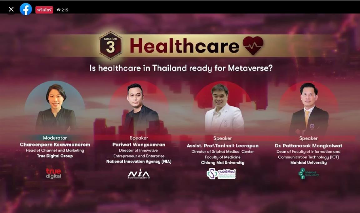 On 26 April 2022 – Dr. Pattanasak Mongkolwat, Dean of the Faculty of Information and Communication Technology, Mahidol University (ICT Mahidol), together with Mr. Pariwat Wongsamran, Director of Entrepreneur and Enterprise, Director of Startup Thailand at National Innovation Agency (Public Organization), Asst. Prof. Taninnit Leerapan, Director of Center for Medical Excellence, Faculty of Medicine, Chiang Mai University, as panelists, and Ms. Charoenporn Kaewmanorom, Head of Marketing and Channel Development at True Digital Group, as the MC, shared their experiences on application of Digital Technology to increase medical efficiency, as well as factors influencing the metaverse in the medical field on the topic “Metaverse & Healthcare: the Rise of Metaverse in Healthcare. Is healthcare in Thailand ready for Metaverse?” in the virtual conference, “Metaverse & Digital Solutions Thailand 2022”, held by True Digital Group, via Facebook Live: True Digital Solutions.