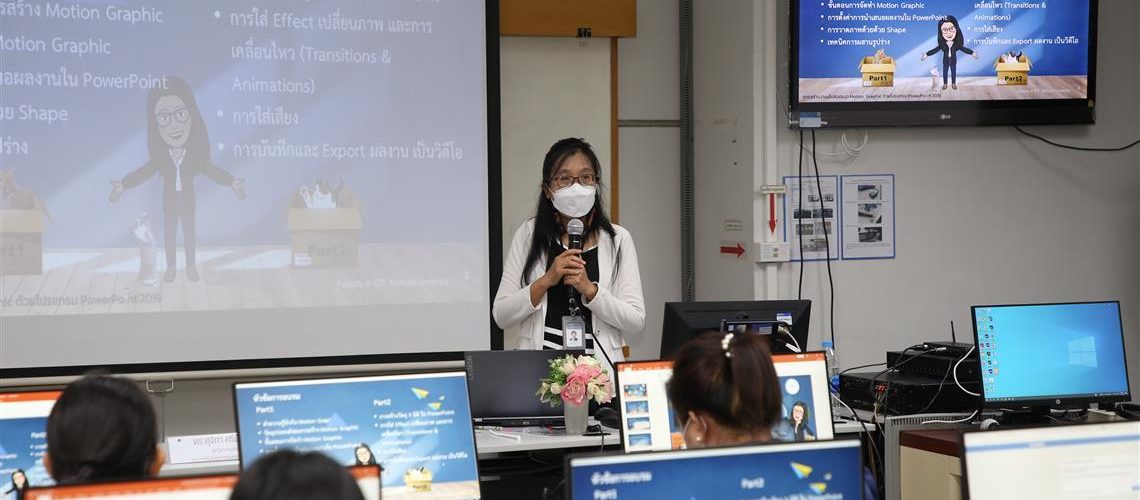 On 28 April, 2022 – Dr. Sujika Srinuntakul, Educator, from the Faculty of Information and Communication Technology, Mahidol University (ICT Mahidol), served as a guest speaker on a project to improve the operational efficiency of the staff of Mahidol University’s Office of the President on the topic “Creating Motion Graphic Presentations with PowerPoint”. The event was held by the Human Resources Division at the Computer Laboratory, Office of the President, Mahidol University.