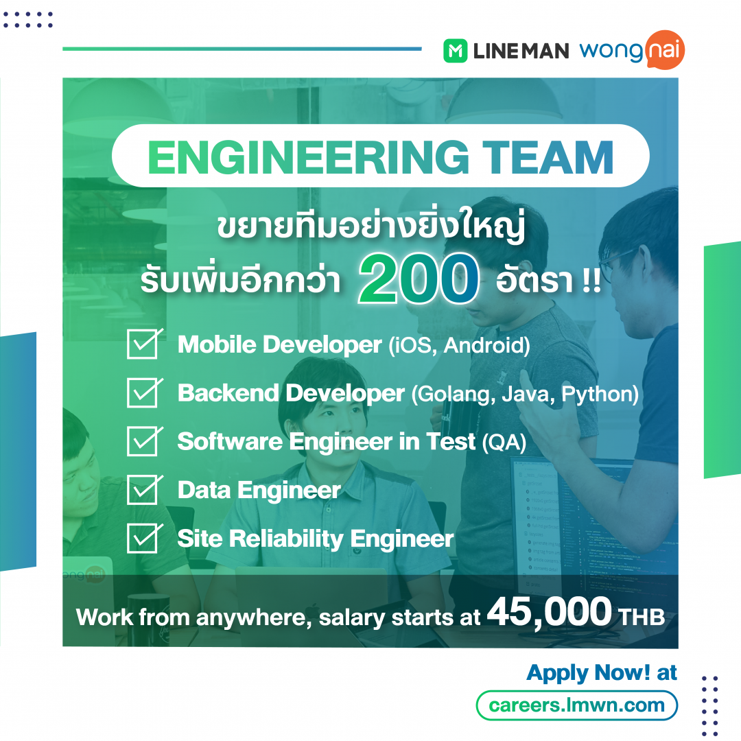 Job Vacancy from LINE MAN Wongnai February 10, 2022February 10, 2022 Apply click 👉https://bit.ly/engineering_2022 For more information, please contact us 👉 Facebook: Life@LINEMANWongnai