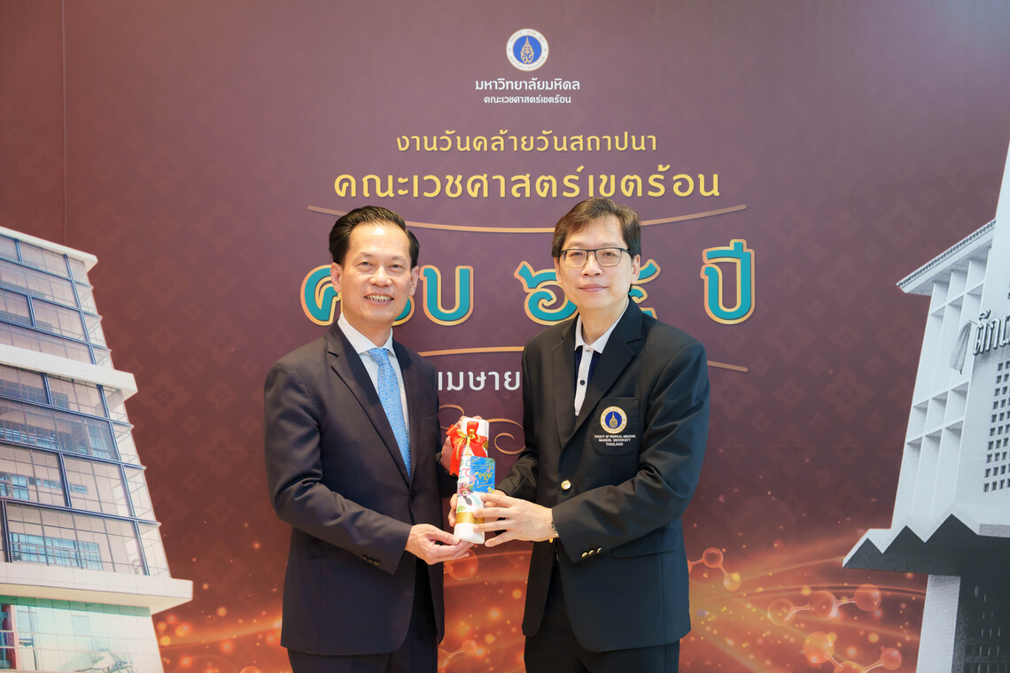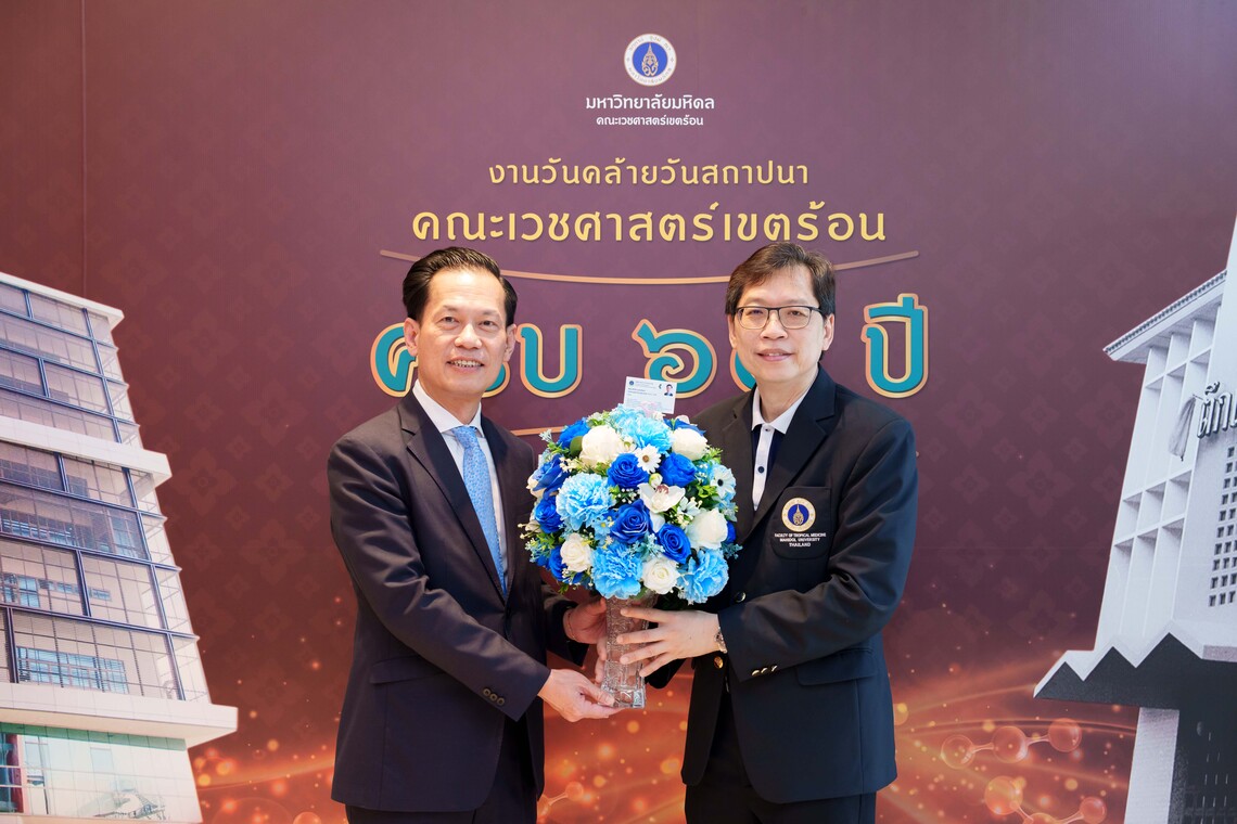วันที่ 5 เมษายน 2567 ดร. พัฒนศักดิ์ มงคลวัฒน์ คณบดี คณะเทคโนโลยีสารสนเทศและการสื่อสาร มหาวิทยาลัยมหิดล (ICT Mahidol) ร่วมแสดงความยินดี เนื่องในโอกาสครบรอบ 64 ปี วันคล้ายวันสถาปนาคณะเวชศาสตร์เขตร้อน มหาวิทยาลัยมหิดล โดยมี รองศาสตราจารย์ นายแพทย์ วีระพงษ์ ภูมิรัตนประพิณ คณบดีคณะเวชศาสตร์เขตร้อน ให้การต้อนรับ ณ ห้องประชุมมีเกรท ชั้น 8 อาคารเฉลิมพระเกียรติฉลองสิริราชสมบัติครบ 60 ปี คณะเวชศาสตร์เขตร้อน มหาวิทยาลัยมหิดล