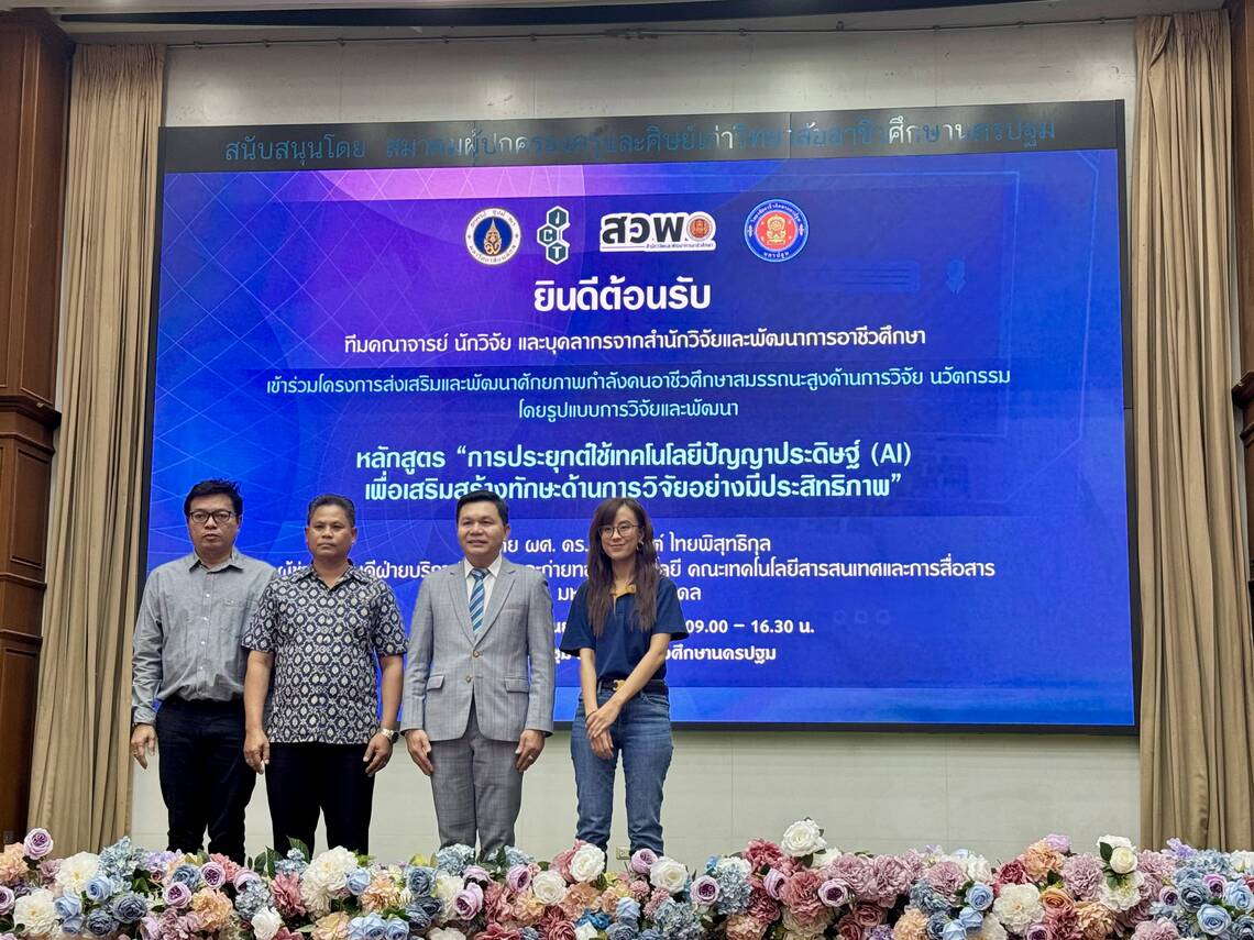 วันที่ 20 กันยายน 2567 คณะเทคโนโลยีสารสนเทศและการสื่อสาร มหาวิทยาลัยมหิดล (ICT Mahidol) จัดโครงการอบรม “การประยุกต์ใช้เทคโนโลยีปัญญาประดิษฐ์ (AI) เพื่อเสริมสร้างทักษะด้านการวิจัยอย่างมีประสิทธิภาพ สำหรับสำนักวิจัยและพัฒนาการอาชีวศึกษา” โดยได้รับเกียรติจาก ดร. นิรุตต์ บุตรแสนลี ผู้อำนวยการสำนักวิจัยและพัฒนาการอาชีวศึกษา เป็นผู้กล่าวเปิดการอบรม และ ผศ.ดร. ทิพาจินต์ ไทยพิสุทธิกุล ผู้ช่วยคณบดีฝ่ายบริการวิชาการและถ่ายทอดเทคโนโลยี เป็นวิทยากรถ่ายทอดความรู้ด้านการประยุกต์ใช้ปัญญาประดิษฐ์ (Artificial Intelligence (AI)) เพื่อช่วยเหลือในการพัฒนางานวิจัย ให้แก่บุคลากรด้านการวิจัย ณ วิทยาลัยอาชีวศึกษานครปฐม จังหวัดนครปฐม