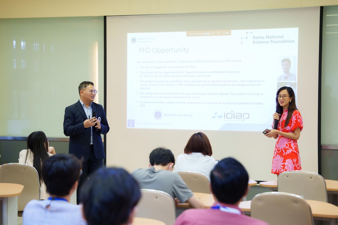 วันที่ 17 กรกฎาคม 2567 คณะเทคโนโลยีสารสนเทศและการสื่อสาร มหาวิทยาลัยมหิดล (ICT Mahidol) จัดโครงการสัมมนาวิชาการ “Applied AI on Multidisciplinary Topics” โดยได้รับเกียรติจาก ดร. ทิพาจินต์ ไทยพิสุทธิกุล ผู้ช่วยคณบดีฝ่ายบริการวิชาการและถ่ายทอดเทคโนโลยี เป็นผู้กล่าวเปิดโครงการฯ พร้อมด้วย รศ.ดร. วรพันธ์ คู่สกุลนิรันดร์ หัวหน้ากลุ่มวิจัย Machine Vision and Information Transfer Lab (MVIT) และ ประธานหลักสูตรปรัชญาดุษฎีบัณฑิต สาขาวิชาวิทยาการคอมพิวเตอร์ เป็นวิทยากรถ่ายทอดความรู้ในหัวข้อ “Applied AI on Image and Video Data” และ ผศ.ดร. วสกร แลสันกลาง อาจารย์ประจำภาควิชาคณิตศาสตร์ คณะวิทยาศาสตร์ มหาวิทยาลัยมหิดล เป็นวิทยากรถ่ายทอดความรู้ในหัวข้อ “AI in Vehicle Routing Problems” ให้แก่ผู้สนใจ ณ ห้อง IT405 ชั้น 4 คณะ ICT มหาวิทยาลัยมหิดล ศาลายา และในรูปแบบออนไลน์ ผ่านโปรแกรม Webex Meetings