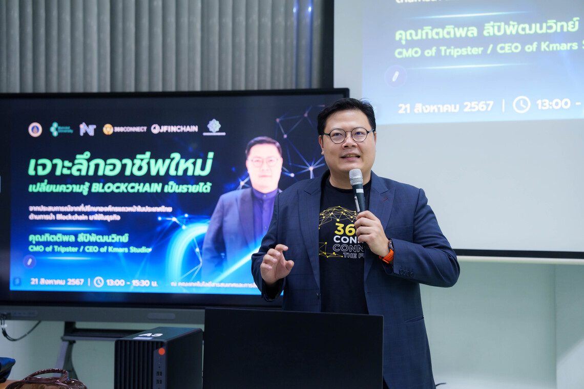 วันที่ 21 สิงหาคม 2567 คณะเทคโนโลยีสารสนเทศและการสื่อสาร มหาวิทยาลัยมหิดล (ICT Mahidol) ร่วมกับ สถาบันบริหารจัดการเทคโนโลยีและนวัตกรรม (iNT) และ แพลตฟอร์ม 360Connect จัดโครงการสัมมนาวิชาการ “เจาะลึกอาชีพใหม่ เปลี่ยนความรู้ Blockchain เป็นรายได้” โดยได้รับเกียรติจาก ผศ. ดร. ทิพาจินต์ ไทยพิสุทธิกุล ผู้ช่วยคณบดีฝ่ายบริการวิชาการและถ่ายทอดเทคโนโลยี เป็นผู้กล่าวเปิดโครงการฯ พร้อมด้วย คุณกิตติพล ลีปิพัฒนวิทย์ ผู้ก่อตั้งและ CEO ของบริษัท เคมาร์ส สตูดิโอ จำกัด และ บริษัท เค อินโนเวชั่น จำกัด ซึ่งเป็นบริษัทเกี่ยวกับ Digital Marketing เป็นผู้ถ่ายทอดความรู้และแบ่งปันประสบการณ์เกี่ยวกับการประยุกต์ใช้ความรู้ Blockchain ในการสร้างรายได้ ให้แก่ คณาจารย์ บุคลากร นักศึกษามหาวิทยาลัยมหิดล และผู้สนใจ ณ ห้อง IT105 ชั้น 1 คณะ ICT มหาวิทยาลัยมหิดล ศาลายา