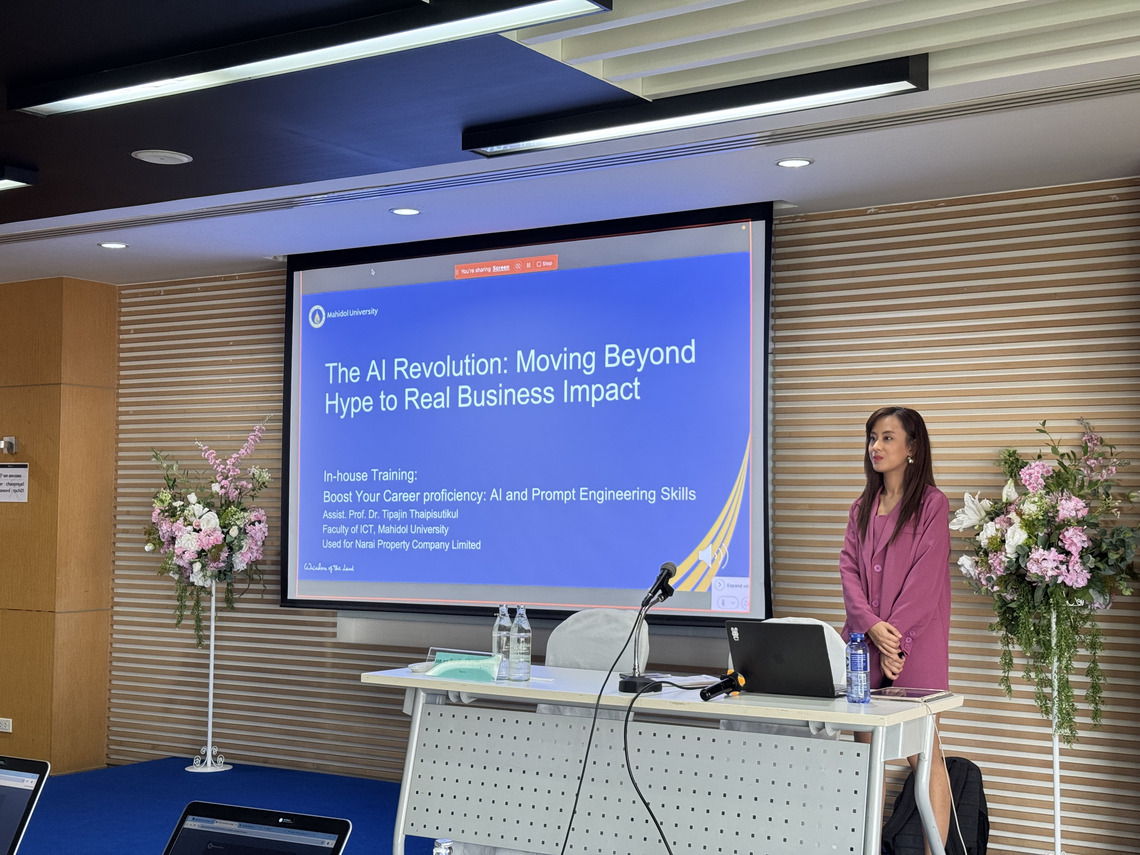 วันที่ 9 ตุลาคม 2567 คณะเทคโนโลยีสารสนเทศและการสื่อสาร มหาวิทยาลัยมหิดล (ICT Mahidol) จัดโครงการอบรม “Boost Your Career Proficiency: AI and Prompt Engineering Skills” โดยได้รับเกียรติจาก ผศ.ดร. ทิพาจินต์ ไทยพิสุทธิกุล ผู้ช่วยคณบดีฝ่ายบริการวิชาการและถ่ายทอดเทคโนโลยี เป็นวิทยากรถ่ายทอดความรู้เบื้องต้นเกี่ยวกับปัญญาประดิษฐ์ (Artificial Intelligence (AI)) และการออกแบบคำสั่งสำหรับ AI (Prompt Engineering) เบื้องต้น ให้แก่บุคลากรของบริษัท นารายณ์พร็อพเพอตี้ จำกัด จังหวัดนนทบุรี โดยได้รับเกียรติจาก คุณสุรศักดิ์ พิมพะสิงห์ ผู้อำนวยการบริหาร สายงานก่อสร้าง เป็นผู้กล่าวเปิดการอบรม