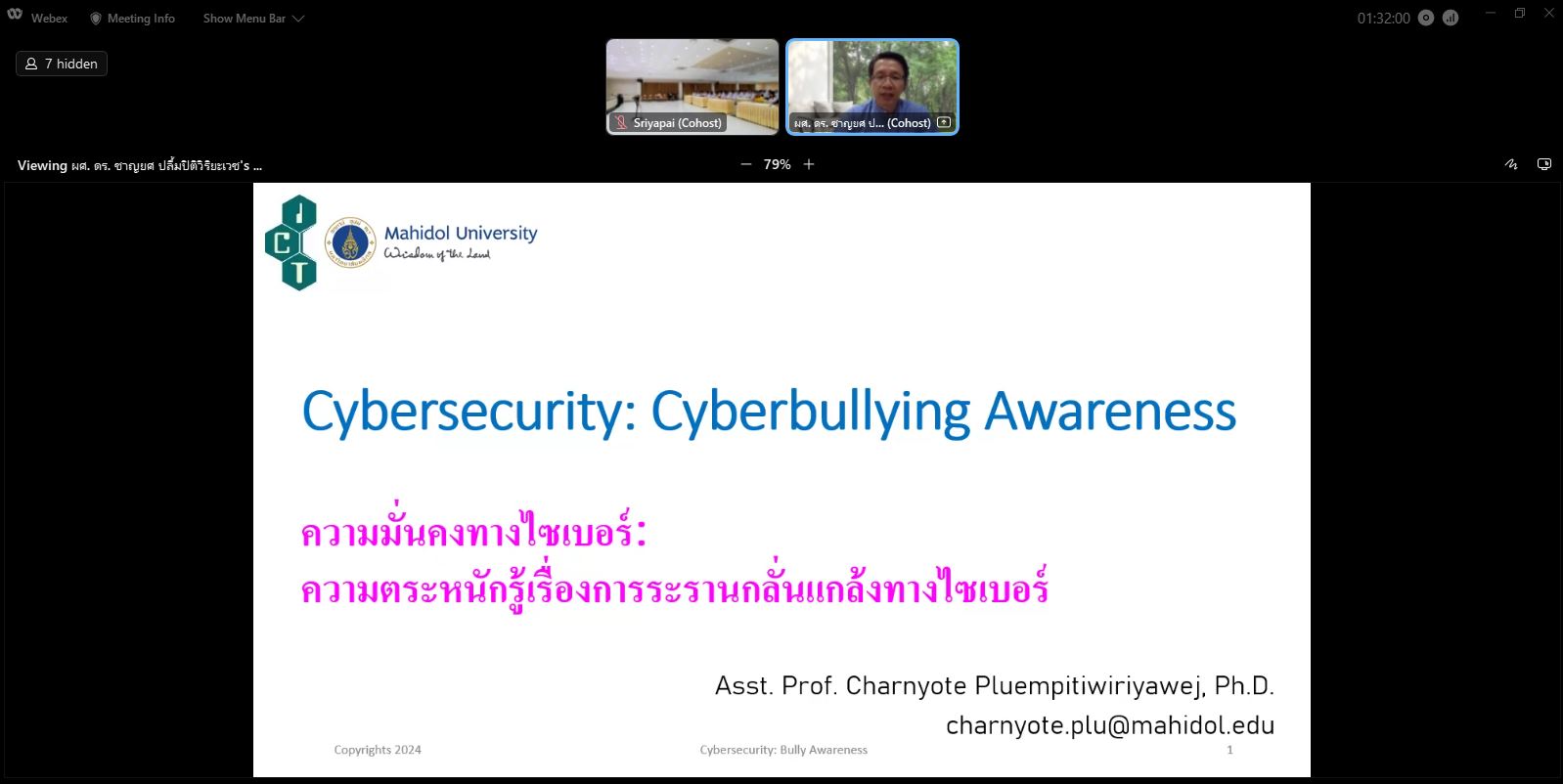 วันที่ 7 มีนาคม 2567 คณะเทคโนโลยีสารสนเทศและการสื่อสาร มหาวิทยาลัยมหิดล (ICT Mahidol) จัดกิจกรรมถ่ายทอดองค์ความรู้ด้าน ICT หัวข้อ “Cyber Security: Cyberbullying Awareness” ให้แก่คณาจารย์ และนักเรียนโรงเรียนศรียาภัย จังหวัดชุมพร โดยได้รับเกียรติจาก คุณนันทชัย แย้มโสพิท รองผู้อำนวยการโรงเรียนศรียาภัย เป็นผู้แทนกล่าวต้อนรับและกล่าวเปิดกิจกรรม และ ผศ.ดร. ชาญยศ ปลื้มปิติวิริยะเวช อาจารย์ประจำกลุ่มวิชาวิทยาการคอมพิวเตอร์ เป็นวิทยากรถ่ายทอดความรู้ให้แก่คณาจารย์ และนักเรียนทุกระดับชั้น จำนวนกว่า 100 คน ในรูปแบบออนไลน์ผ่านโปรแกรม Webex Meetings โดยการอบรมในครั้งนี้ เป็นการถ่ายทอดความรู้เกี่ยวกับกรณีศึกษาของการกลั่นแกล้งบนโลกออนไลน์ (Cyberbullying) ที่เกิดขึ้นในปัจจุบัน เพื่อสร้างความตระหนักรู้ให้กับนักเรียน และเพื่อให้นักเรียนสามารถรับมือกับปัญหา Cyberbullying ซึ่งเป็นปัญหาที่เกิดขึ้นในชุมชนออนไลน์ปัจจุบัน และเป็นหนึ่งในประเด็นสำคัญที่ทั้งครูและนักเรียนต้องมีความรู้ในการรับมือ อีกทั้งยังเป็นการเสริมสร้างความตระหนักให้กับนักเรียนในการใช้เทคโนโลยีอย่างมีสติและมีความรับผิดชอบ และเพื่อร่วมมือกันในการสร้างสังคมออนไลน์ที่เต็มไปด้วยความเคารพและความเข้าใจต่อกัน รวมถึงสร้างสังคมออนไลน์ที่ปลอดภัยและเต็มไปด้วยความเอื้อเฟื้อในการแบ่งปันความรู้ที่เป็นประโยชน์