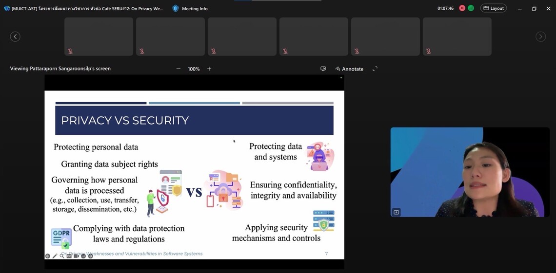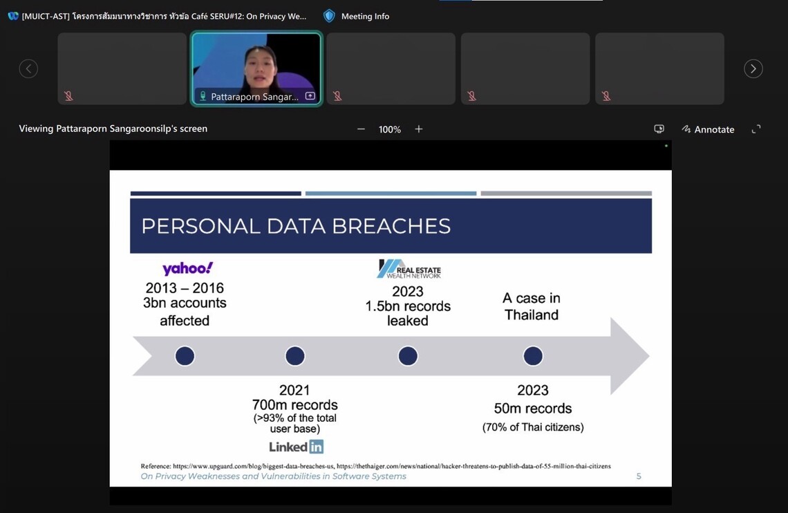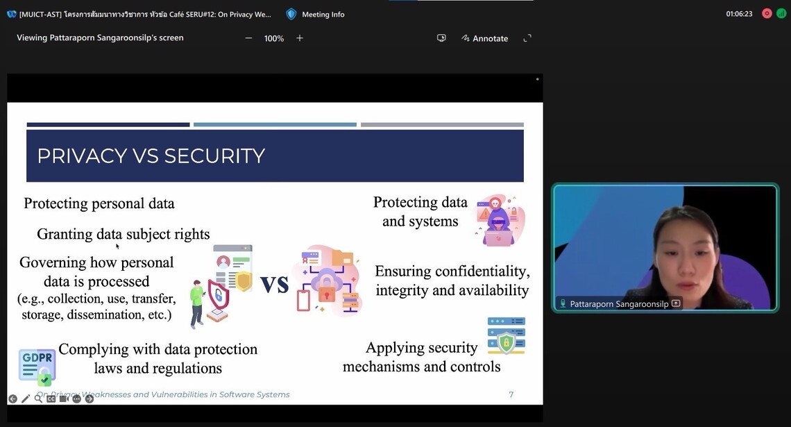วันที่ 14 สิงหาคม 2567 คณะเทคโนโลยีสารสนเทศและการสื่อสาร มหาวิทยาลัยมหิดล (ICT Mahidol) ร่วมกับกลุ่มวิจัย Software Engineering Research Unit (SERU) ในคลัสเตอร์วิจัย Software Engineering and Business Analytics Research Clusters (SEBA) จัดโครงการสัมมนาวิชาการ Café SERU#12: On Privacy Weaknesses and Vulnerabilities in Software Systems โดยได้รับเกียรติจาก ดร. ภัทรพร แสงอรุณศิลป์ อาจารย์ประจำกลุ่มวิชาวิทยาการคอมพิวเตอร์ และกลุ่มวิจัยวิศวกรรมซอฟต์แวร์และการวิเคราะห์ธุรกิจ (Software Engineering and Business Analytics Research Clusters (SEBA)) เป็นผู้ถ่ายทอดองค์ความรู้เกี่ยวกับการตระหนักถึงความเป็นส่วนตัว และข้อมูลส่วนบุคคลของผู้ใช้งาน ในทุกขั้นตอนของการพัฒนาซอฟต์แวร์ อาทิ ความเป็นส่วนตัวในวิศวกรรมซอฟต์แวร์ (Privacy in Software Engineering) ภัยคุกคามในการพัฒนาแอปพลิเคชัน และแนวทางในการระบุช่องโหว่ที่เกี่ยวข้องกับความเป็นส่วนตัวในระบบซอฟต์แวร์ ให้แก่ คณาจารย์ บุคลากร นักศึกษามหาวิทยาลัยมหิดล และผู้สนใจ ในรูปแบบออนไลน์ ผ่านโปรแกรม Webex Meetings