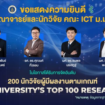 เรื่อง กรกฎาคม 21, 2025สิงหาคม 15, 2025by Thitinart EaksamanontIn ผลงานและรางวัลบุคลากร คณาจารย์และนักวิจัยคณะ ICT ม.มหิดล (ICT Mahidol) ได้รับการจัดอันดับใน 200 นักวิจัยผู้มีผลงานตามเกณฑ์ Mahidol University’s Top 100 Researcher 2026