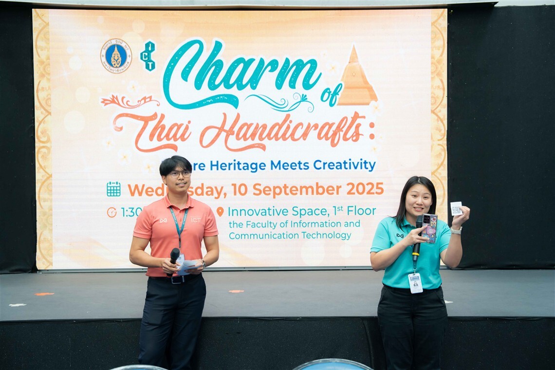 กิจกรรม “Charm of Thai Handicrafts: Where Heritage Meets Creativity” เป็นกิจกรรมที่คณะ ICT จัดขึ้น เพื่อส่งเสริมบรรยากาศความเป็นนานาชาติ โดยมุ่งเน้นให้คณาจารย์ บุคลากร นักศึกษาชาวไทยและชาวต่างชาติ ได้เรียนรู้และแลกเปลี่ยนทางวัฒนธรรม ผ่านการทำกิจกรรมต่างๆ ภายในงานร่วมกัน อาทิ การเขียนสีหัวเขน การประดิษฐ์พวงกุญแจประดับลวดลายมุก การเพ้นท์ลายบนถุงผ้า รวมทั้งมีการจัดบูธอาหารไทยและอาหารนานาชาติเพื่อสะท้อนเอกลักษณ์ความเป็นนานาชาติอีกด้วย