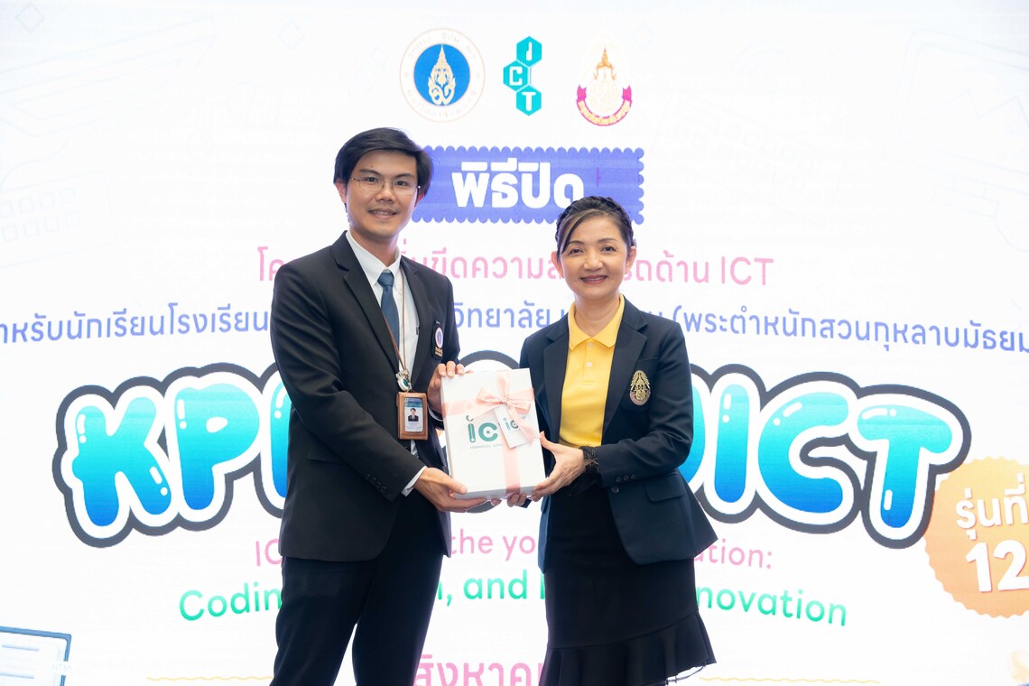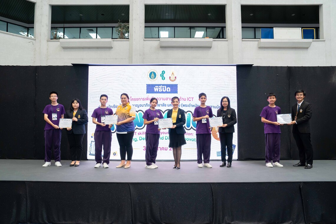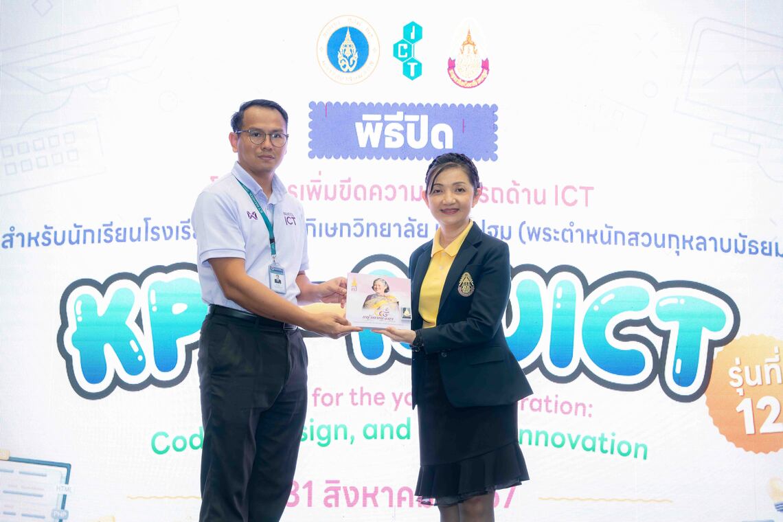 วันที่ 31 สิงหาคม 2567 คณะเทคโนโลยีสารสนเทศและการสื่อสาร มหาวิทยาลัยมหิดล (ICT Mahidol) ร่วมกับโรงเรียนกาญจนาภิเษกวิทยาลัยนครปฐม (พระตำหนักสวนกุหลาบมัธยม) จัดพิธีปิดการอบรม “โครงการเพิ่มขีดความสามารถด้าน ICT สำหรับนักเรียนโรงเรียนกาญจนาภิเษกวิทยาลัย นครปฐม (พระตำหนักสวนกุหลาบมัธยม)” รุ่นที่ 12 ให้แก่นักเรียนระดับชั้นมัธยมศึกษาตอนต้นและมัธยมศึกษาตอนปลายที่เข้าร่วมการอบรมฯ โดยได้รับเกียรติจาก ผศ.ดร. ธนพล นรเสฏฐ์ ผู้ช่วยคณบดีฝ่ายการศึกษา และ ดร. กมลชนก ภาคภูมิ หัวหน้ากลุ่มบริหารวิชาการ โรงเรียนกาญจนาภิเษกวิทยาลัย นครปฐม (พระตำหนักสวนกุหลาบมัธยม) เป็นผู้กล่าวปิดการอบรม พร้อมมอบเกียรติบัตรให้แก่นักเรียน ร่วมกับ ดร. ศุจิกา ศรีนันทกุล งานโสตและเทคโนโลยีสื่อการศึกษา และคณะครูโรงเรียนกาญจนาภิเษกวิทยาลัย นครปฐม (พระตำหนักสวนกุหลาบมัธยม) ณ ลาน Innovative Space ชั้น 1 คณะ ICT มหาวิทยาลัยมหิดล ศาลายา