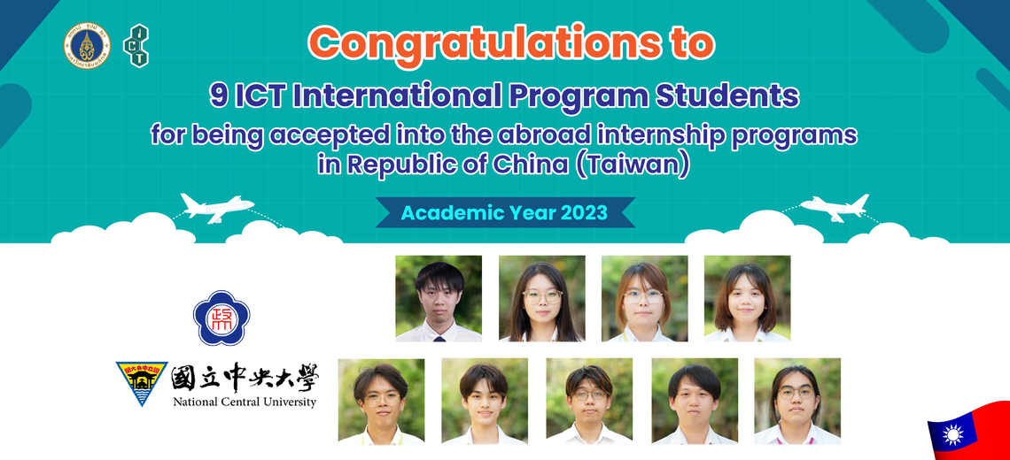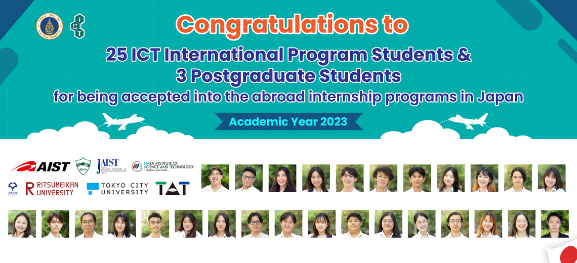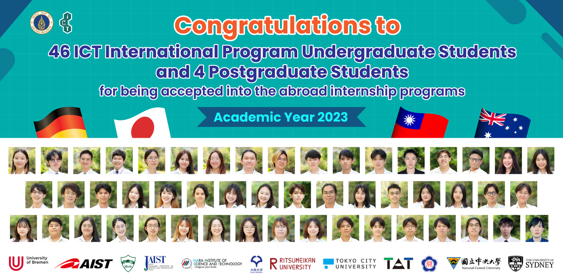 คณะเทคโนโลยีสารสนเทศและการสื่อสาร มหาวิทยาลัยมหิดล (ICT Mahidol) ขอแสดงความยินดีกับนักศึกษาหลักสูตรวิทยาศาสตรบัณฑิต สาขาวิชาเทคโนโลยีสารสนเทศและการสื่อสาร (ICT หลักสูตรนานาชาติ) จำนวน 46 คน นักศึกษาหลักสูตรหลักสูตรวิทยาศาสตรมหาบัณฑิต และปรัชญาดุษฎีบัณฑิต สาขาวิชาวิทยาการคอมพิวเตอร์ จำนวน 4 คน ที่ได้รับการตอบรับให้เข้าร่วมโครงการฝึกประสบการณ์วิชาชีพด้าน ICT ประจำปีการศึกษา 2566 ณ ต่างประเทศ ดังนี้