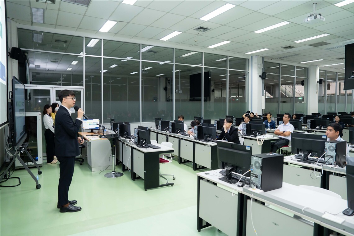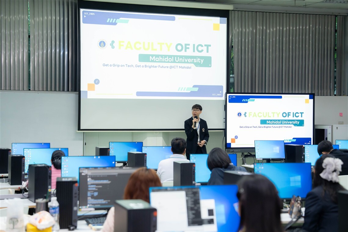 ทั้งนี้ หลังเสร็จสิ้นการอบรม ดร. พิสิฐ ไพรวัฒนา ผู้ช่วยคณบดีฝ่ายสื่อสารองค์กรและเทคโนโลยีสื่อ ได้ให้เกียรติแนะนำหลักสูตรการเรียนการสอนของคณะฯ และข้อมูลเกณฑ์การรับสมัคร ในหลักสูตรวิทยาศาสตรบัณฑิต สาขาวิชาเทคโนโลยีสารสนเทศและการสื่อสาร (ICT หลักสูตรนานาชาติ) และสาขาวิชาวิทยาการและเทคโนโลยีดิจิทัล (DST หลักสูตรไทย) ประจำปีการศึกษา 2569 รวมทั้งมอบประกาศนียบัตร และกล่าวปิดการอบรม
