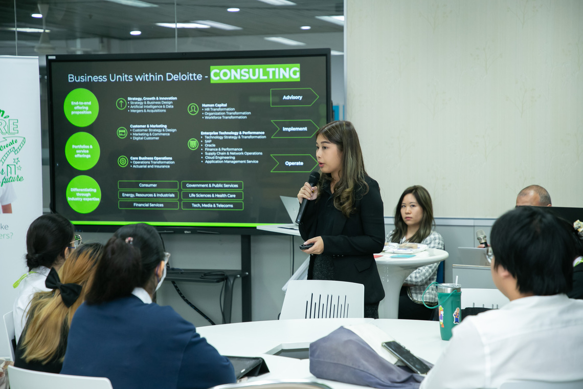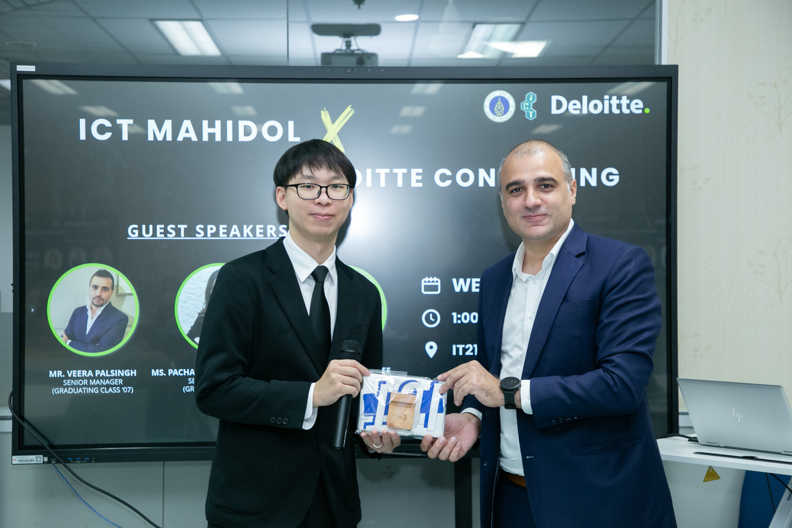วันที่ 22 พฤศจิกายน 2566 คณะเทคโนโลยีสารสนเทศและการสื่อสาร มหาวิทยาลัยมหิดล (ICT Mahidol) จัดกิจกรรมบรรยายพิเศษในหัวข้อ “ICT Mahidol x Deloitte: Discover Deloitte Consulting” โดยได้รับเกียรติจาก ดร. พิสิฐ ไพรวัฒนา ผู้ช่วยคณบดีฝ่ายสื่อสารองค์กรและเทคโนโลยีสื่อ เป็นผู้กล่าวเปิดกิจกรรม พร้อมด้วย Mr. Veera Palsingh, Senior Manager นักศึกษาหลักสูตรวิทยาศาสตรมหาบัณฑิต สาขาวิชาวิทยาการคอมพิวเตอร์ คุณวิภาดา เด่นดี และ คุณพัชรมัย อยู่สุขสถาพร Senior Consultant ซึ่งเป็นศิษย์เก่า ICT รุ่น 11 และ 16 จากบริษัท ดีลอยท์ คอนซัลติ้ง จำกัด เป็นวิทยากรแนะนำเกี่ยวกับภาพรวม และโอกาสในการร่วมงานกับบริษัท นอกจากนี้ ยังมีการบรรยายพิเศษเกี่ยวกับเทรนด์ของเทคโนโลยีในปัจจุบัน และ Workshop ในหัวข้อ “Imagine This: Be CEO For a Day” โดยมีนักศึกษาหลักสูตรวิทยาศาสตรบัณฑิต สาขาวิชาเทคโนโลยีสารสนเทศและการสื่อสาร (ICT หลักสูตรนานาชาติ) และสาขาวิชาวิทยาการและเทคโนโลยีดิจิทัล (DST หลักสูตรไทย) เข้าร่วมกิจกรรมกว่า 30 คน ณ ห้อง IT210 ชั้น 2 คณะ ICT มหาวิทยาลัยมหิดล ศาลายา