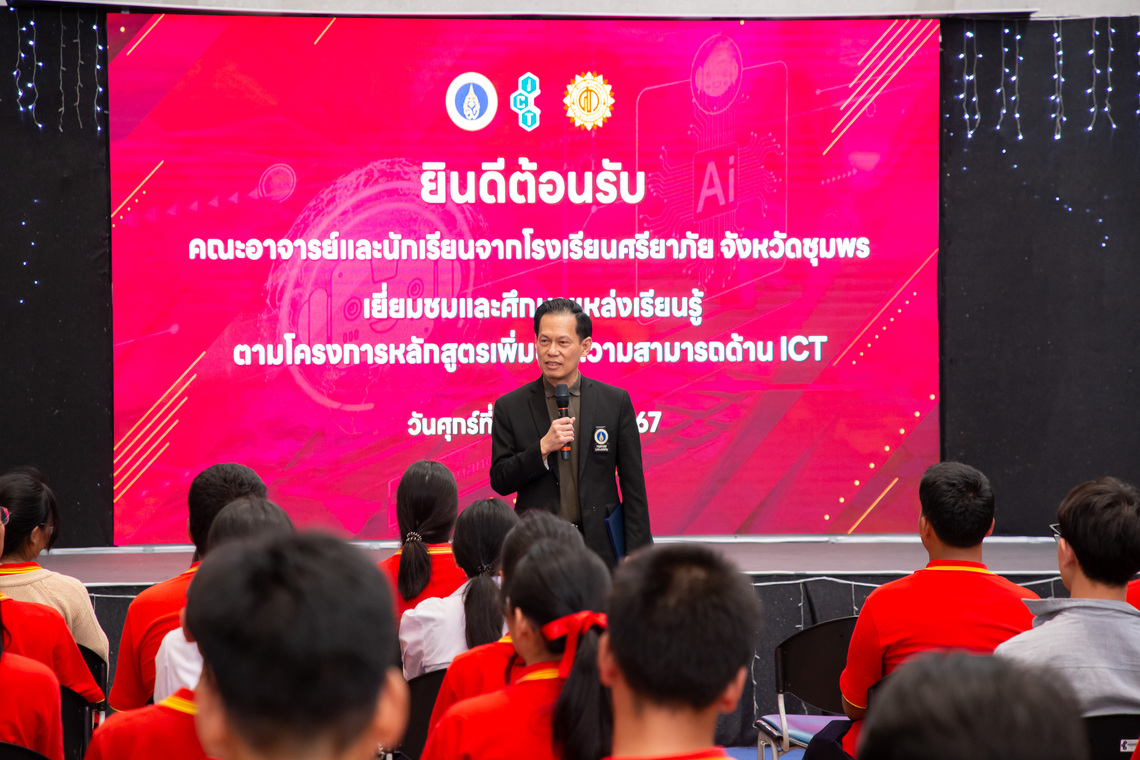 วันที่ 5 มกราคม 2567 คณะเทคโนโลยีสารสนเทศและการสื่อสาร มหาวิทยาลัยมหิดล (ICT Mahidol) ร่วมกับโรงเรียนศรียาภัย จังหวัดชุมพร จัดโครงการอบรมให้แก่นักเรียนชั้นมัธยมศึกษาตอนปลาย “หลักสูตรอบรมเพิ่มขีดความสามารถด้าน ICT สำหรับนักเรียน โรงเรียนศรียาภัย จังหวัดชุมพร” จำนวน 59 คน โดยได้รับเกียรติจาก ดร. พัฒนศักดิ์ มงคลวัฒน์ คณบดี กล่าวต้อนรับและเปิดการอบรม ณ ลาน Innovative Space คณะ ICT มหาวิทยาลัยมหิดล ศาลายา