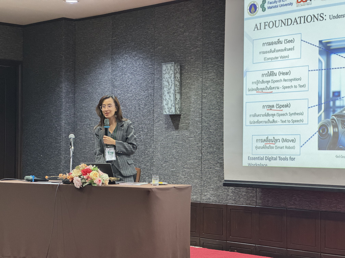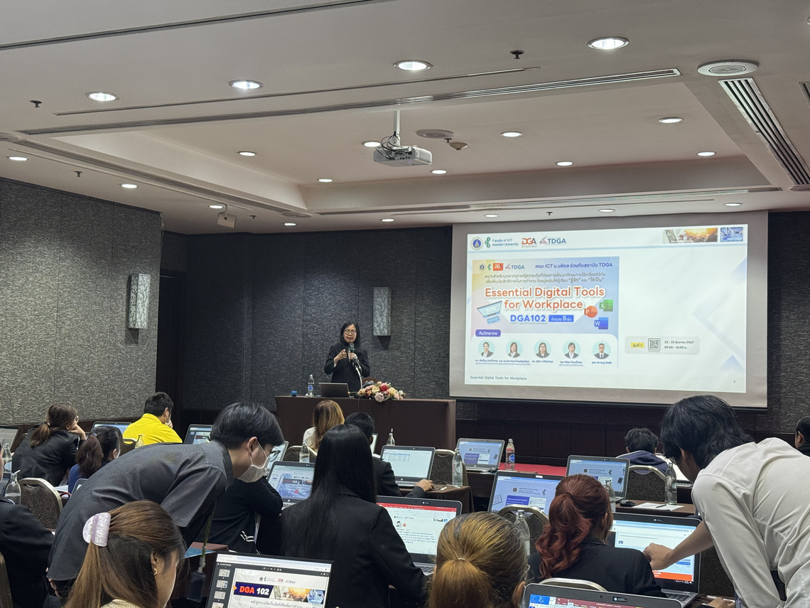 วันที่ 23 – 25 ธันวาคม 2567 คณะเทคโนโลยีสารสนเทศและการสื่อสาร มหาวิทยาลัยมหิดล (ICT Mahidol) ร่วมกับ สถาบันพัฒนาบุคลากรภาครัฐด้านดิจิทัล (TDGA) จัดโครงการอบรมเชิงปฏิบัติการหลักสูตร “การใช้เครื่องมือดิจิทัลเพื่อการทำงาน (Essential Digital Tools for Workplace) (DGA102)” รุ่นที่ 1 โดยได้รับเกียรติจาก ผศ. ดร. ทิพาจินต์ ไทยพิสุทธิกุล ผู้ช่วยคณบดีฝ่ายบริการวิชาการและถ่ายทอดเทคโนโลยี ดร. ศิริเพ็ญ พงษ์ไพเชฐ ผู้ช่วยคณบดีฝ่ายสารสนเทศและระบบ คุณศิริพร โรจนโกศล ผู้ช่วยคณบดีฝ่ายเทคโนโลยีสารสนเทศ ดร. ศุจิกา ศรีนันทกุล งานโสตและเทคโนโลยีสื่อการศึกษา และ คุณปราชญ์ ชัยศิริ นักวิชาการคอมพิวเตอร์ งานสารสนเทศและระบบ ร่วมเป็นวิทยากรถ่ายทอดองค์ความรู้เกี่ยวกับการใช้เครื่องมือดิจิทัลต่างๆ เพื่อพัฒนาทักษะและเพิ่มประสิทธิภาพในการทำงาน ให้แก่บุคลากรของภาครัฐ จำนวน 36 คน ณ โรงแรม Century Park Hotel กรุงเทพมหานครฯ