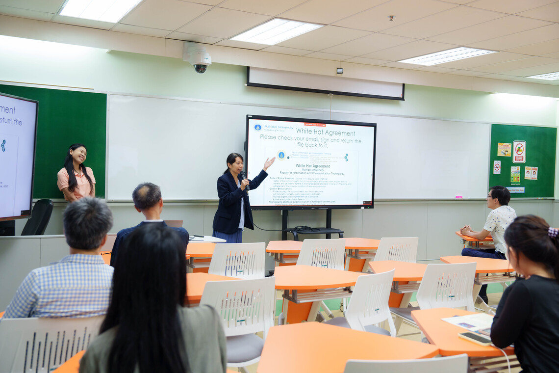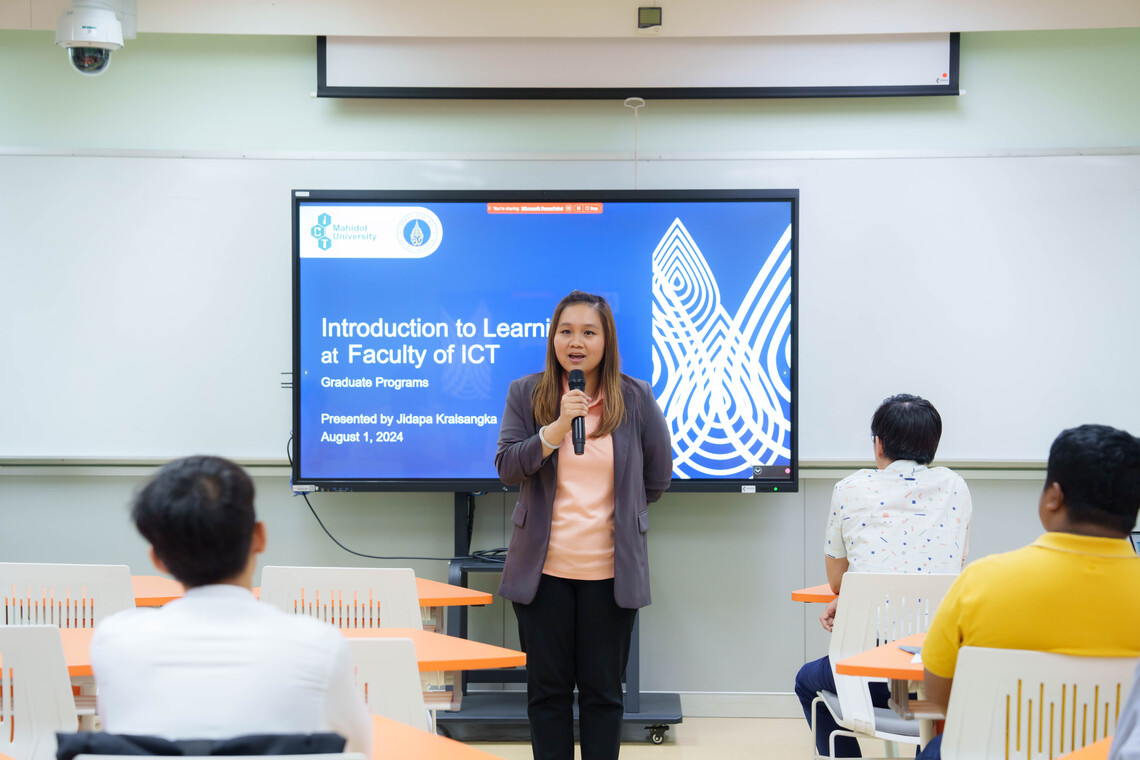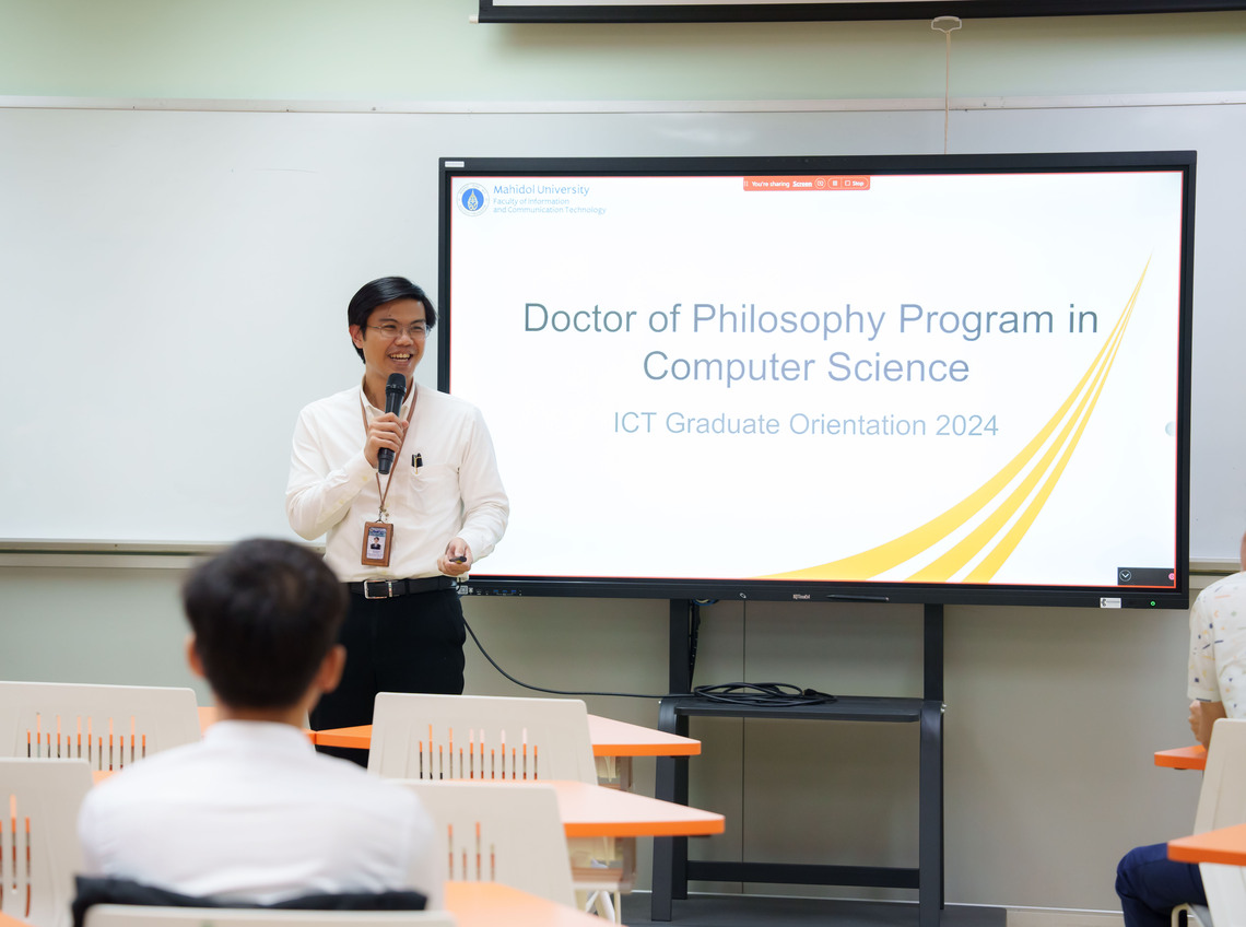 วันที่ 1 สิงหาคม 2567 คณะเทคโนโลยีสารสนเทศและการสื่อสาร มหาวิทยาลัยมหิดล (ICT Mahidol) จัดพิธีปฐมนิเทศนักศึกษาใหม่ ระดับบัณฑิตศึกษา ประจำปีการศึกษา 2567 ให้แก่นักศึกษาหลักสูตรปรัชญาดุษฎีบัณฑิต สาขาวิชาวิทยาการคอมพิวเตอร์ หลักสูตรวิทยาศาสตรมหาบัณฑิต สาขาวิชาความมั่นคงไซเบอร์และการประกันสารสนเทศ สาขาวิชาเทคโนโลยีเกมและเกมมิฟิเคชัน และสาขาวิชาวิทยาการคอมพิวเตอร์ โดยได้รับเกียรติจาก ผศ.ดร. จิดาภา ไกรสังข์ ผู้ช่วยคณบดีฝ่ายพัฒนาหลักสูตร กล่าวต้อนรับนักศึกษาใหม่ พร้อมด้วย แนะนำภาพรวมการเรียนการสอนของหลักสูตรบัณฑิตศึกษา ณ ห้อง IT331 ชั้น 3 คณะ ICT มหาวิทยาลัยมหิดล ศาลายา และในรูปแบบออนไลน์ ผ่านโปรแกรม Webex Meetings