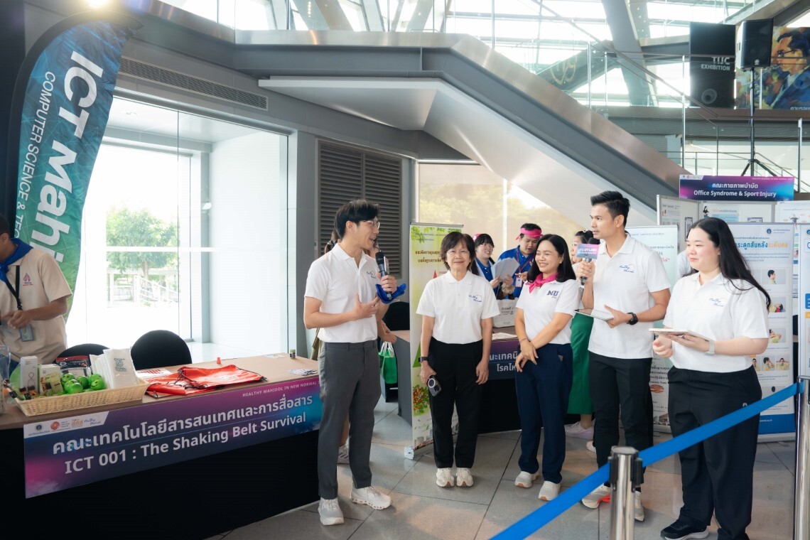 วันที่ 17 กันยายน 2568 ดร.เพชร สัจจชลพันธ์ รองคณบดีฝ่ายบริหารและทรัพยากรบุคคล คณะเทคโนโลยีสารสนเทศและการสื่อสาร มหาวิทยาลัยมหิดล (ICT Mahidol) ในฐานะคณะทำงานย่อยขับเคลื่อนงานนโยบายการส่งเสริมสุขภาพในมหาวิทยาลัยมหิดล และ ดร.ปวิตรา เลี่ยมรักษ์ รองคณบดีฝ่ายพัฒนาองค์กรและกิจการพิเศษ พร้อมด้วยคณะทำงานเสริมสร้างความสุขและความผูกพัน คณะ ICT ร่วมจัดบูธ “ICT 001 : The Shaking Belt Survival” ในงาน “นิทรรศการ Healthy University Day – HEALTHY MAHIDOL in New Normal 2025: มหิดลสุขภาพดีวิถีใหม่ 2568” ในโซนบูธสุขภาพ เพื่อร่วมให้ความรู้และจัดกิจกรรมเสริมสร้างสุขภาพให้แก่บุคลากรและนักศึกษามหาวิทยาลัยมหิดล โดยได้รับเกียรติจาก ศาสตราจารย์ นายแพทย์ปิยะมิตร ศรีธรา อธิการบดีมหาวิทยาลัยมหิดล เป็นประธานกล่าวเปิดงาน และ รองศาสตราจารย์ ดร.ธันวดี สุขสาโรจน์ ผู้อำนวยการสถาบันพัฒนาสุขภาพอาเซียน และเลขาธิการเครือข่ายมหาวิทยาลัยอาเซียนด้านการสร้างเสริมสุขภาพ (AUN-HPN) กล่าวรายงานวัตถุประสงค์ ณ โถงอาคารมหิดลสิทธาคาร มหาวิทยาลัยมหิดล ศาลายา