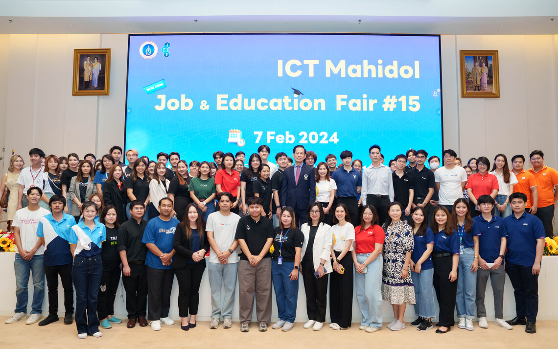 วันที่ 7 กุมภาพันธ์ 2567 คณะเทคโนโลยีสารสนเทศและการสื่อสาร มหาวิทยาลัยมหิดล (ICT Mahidol) จัดกิจกรรม ICT Mahidol Job & Education Fair #15 โดยได้รับเกียรติจาก ดร. พัฒนศักดิ์ มงคลวัฒน์ คณบดี เป็นผู้กล่าวเปิดงาน และกล่าวขอบคุณบริษัทที่มาร่วมออกบูธรับสมัครงานและนักศึกษาฝึกงาน และสถาบันการศึกษาต่างประเทศที่มาร่วมแนะแนวการศึกษาต่อ พร้อมด้วย ผศ.ดร. จิดาภา ไกรสังข์ ผู้ช่วยคณบดีฝ่ายพัฒนาหลักสูตร และ ดร. พิสิฐ ไพรวัฒนา ผู้ช่วยคณบดีฝ่ายสื่อสารองค์กรและเทคโนโลยีสื่อ รับหน้าที่พิธีกรดำเนินรายการ ณ ห้อง Grand Auditorium และห้อง Bits & Bytes Hall คณะ ICT มหาวิทยาลัยมหิดล ศาลายา