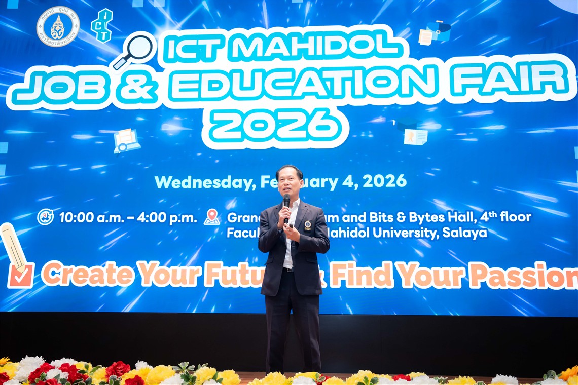 วันที่ 4 กุมภาพันธ์ 2569 คณะเทคโนโลยีสารสนเทศและการสื่อสาร มหาวิทยาลัยมหิดล (ICT Mahidol) จัดกิจกรรม “ICT Mahidol Job & Education Fair 2026” โดยได้รับเกียรติจาก ดร.พัฒนศักดิ์ มงคลวัฒน์ คณบดีคณะเทคโนโลยีสารสนเทศและการสื่อสาร เป็นประธานกล่าวเปิดงาน พร้อมกล่าวต้อนรับและขอบคุณบริษัทที่เข้าร่วมออกบูธรับสมัครงานและนักศึกษาฝึกงาน ตลอดจนสถาบันการศึกษาจากต่างประเทศที่เข้าร่วมให้ข้อมูลและแนะแนวการศึกษาต่อแก่ผู้เข้าร่วมงาน ณ ห้อง Grand Auditorium และ ห้อง Bits & Bytes Hall คณะ ICT มหาวิทยาลัยมหิดล ศาลายา