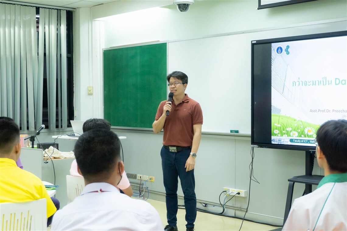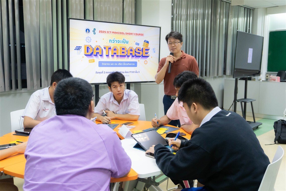 วันที่ 2 กรกฎาคม 2568 คณะเทคโนโลยีสารสนเทศและการสื่อสาร มหาวิทยาลัยมหิดล (ICT Mahidol) จัดกิจกรรม 2025 ICT Mahidol Short Course หัวข้อ “กว่าจะเป็น Database!” โดยได้รับเกียรติจาก ผศ.ดร.ปรีชา ตั้งวรกิจถาวร อาจารย์ประจำกลุ่มวิชาวิทยาการคอมพิวเตอร์ เป็นวิทยากรถ่ายทอดความรู้เกี่ยวกับการจัดการฐานข้อมูล (Database) อาทิ พื้นฐานของข้อมูลในโลกยุคดิจิทัล และขั้นตอนการออกแบบระบบฐานข้อมูล ให้แก่นักเรียนชั้นมัธยมศึกษาตอนปลายกว่า 30 คน ณ ห้อง IT331 ชั้น 3 คณะ ICT มหาวิทยาลัยมหิดล ศาลายา