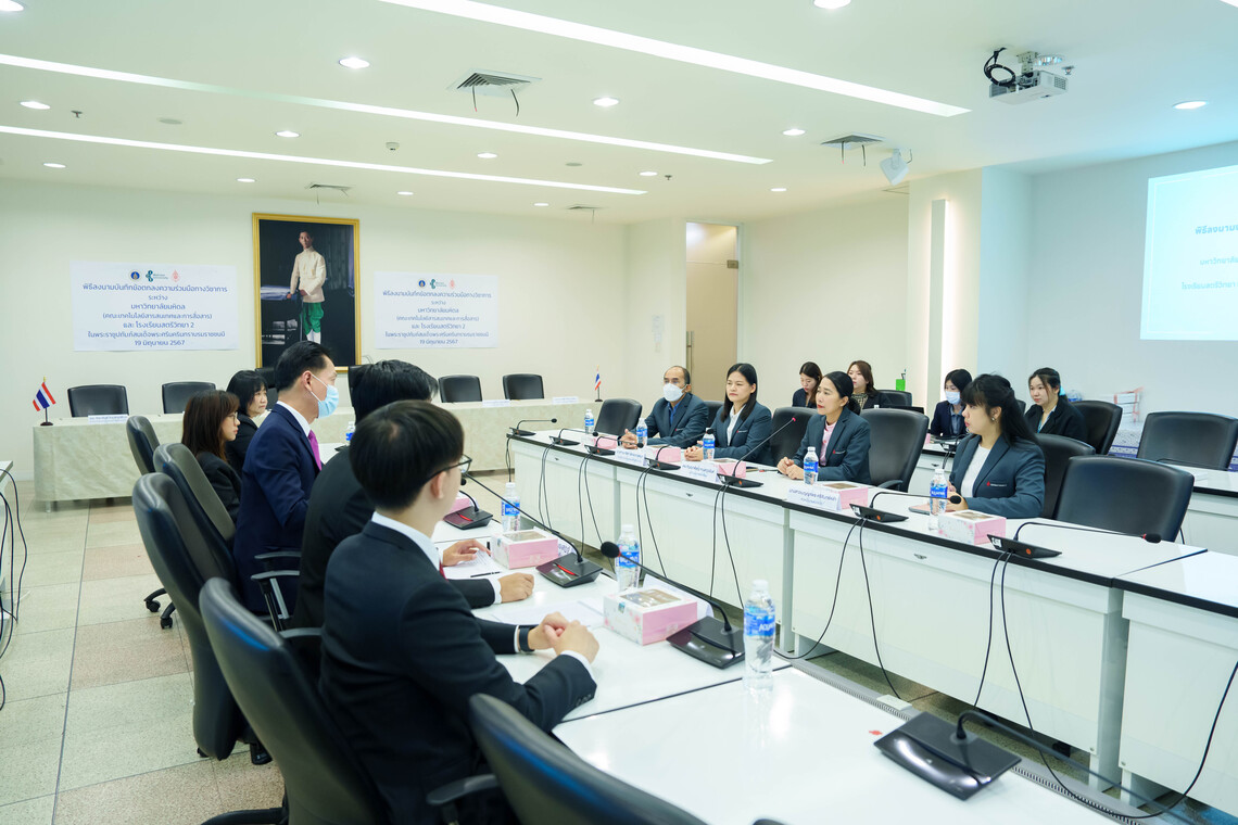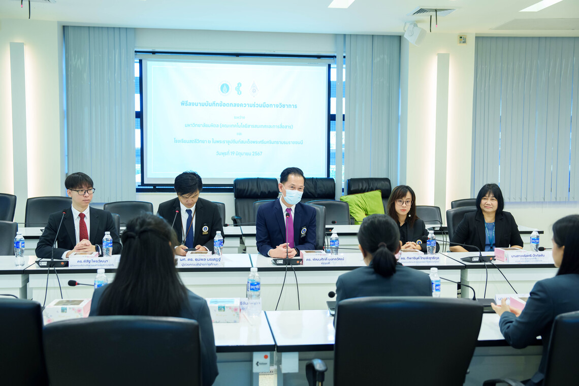 วันที่ 19 มิถุนายน 2567 ดร. พัฒนศักดิ์ มงคลวัฒน์ คณบดี คณะเทคโนโลยีสารสนเทศและการสื่อสาร มหาวิทยาลัยมหิดล (ICT Mahidol) ร่วมลงนามบันทึกข้อตกลงความร่วมมือทางวิชาการ (MoU) กับ ดร. กัญญาพัชญ์ กานต์ภูวนันต์ ผู้อำนวยการ โรงเรียนสตรีวิทยา 2 ในพระราชูปถัมภ์สมเด็จพระศรีนครินทราบรมราชชนนี โดยมี ผศ.ดร. ธนพล นรเสฏฐ์ ผู้ช่วยคณบดีฝ่ายการศึกษา ดร. พิสิฐ ไพรวัฒนา ผู้ช่วยคณบดีฝ่ายสื่อสารองค์กรและเทคโนโลยีสื่อ ดร. ทิพาจินต์ ไทยพิสุทธิกุล ผู้ช่วยคณบดีฝ่ายบริการวิชาการและถ่ายทอดเทคโนโลยี พร้อมด้วย คุณมาลิสา เลิศพฤกษ์พนา รองผู้อำนวยการกลุ่มบริหารวิชาการ และ คุณเบญญาพร ศรีจันทร์หล้า หัวหน้างานแนะแนว โรงเรียนสตรีวิทยา 2 ในพระราชูปถัมภ์สมเด็จพระศรีนครินทราบรมราชชนนี ร่วมเป็นสักขีพยาน ณ ห้อง IT404 ชั้น 4 คณะ ICT มหาวิทยาลัยมหิดล ศาลายา