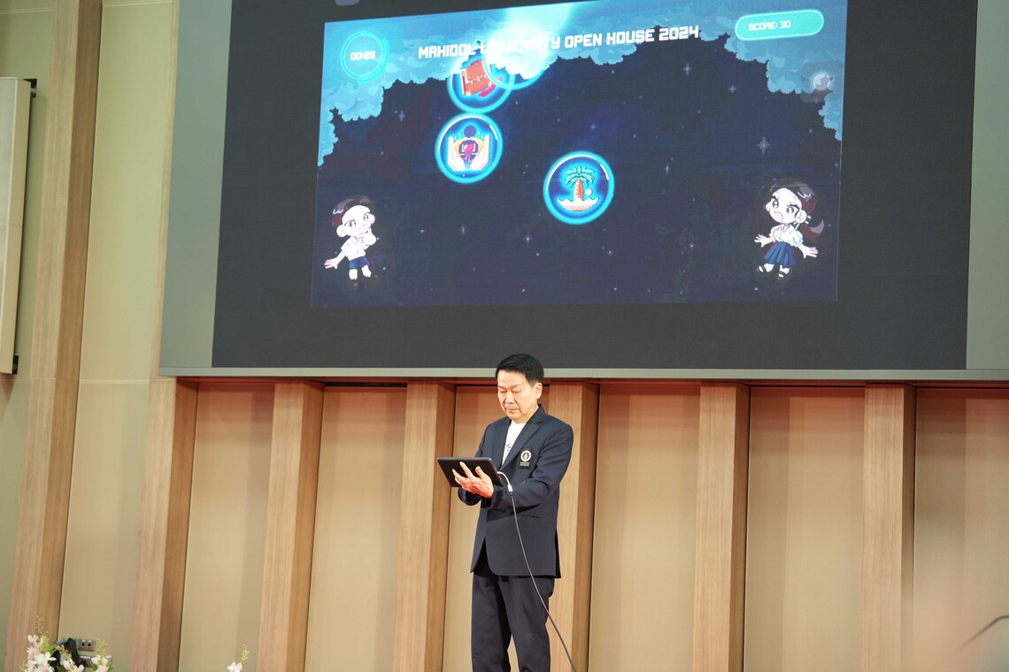 พิธีเปิด Mahidol Open House 2024 ในวันที่ 7 กันยายน 2567 ได้รับเกียรติจาก ศาสตราจารย์ นายแพทย์ปิยะมิตร ศรีธรา รักษาการแทนอธิการบดี มหาวิทยาลัยมหิดล เป็นประธานในพิธี พร้อมเปิดกิจกรรมผ่านเกม “Empowering The Next Generation” ซึ่งเป็นเกมที่พัฒนาต่อยอดมาจากผลงาน “เทพารักษ์พิทักษ์ป่า” ของทีมนักศึกษาหลักสูตรปริญญาตรี สาขาวิชาเทคโนโลยีสารสนเทศและการสื่อสาร (ICT หลักสูตรนานาชาติ) ชั้นปีที่ 3 ที่ได้รับรางวัลชมเชยจากการแข่งขันพัฒนาโปรแกรมคอมพิวเตอร์แห่งประเทศไทย ครั้งที่ 26 (The 26th National Software Contest: NSC 2024) ได้แก่ นายณัชพล มิ่งมหาพันธ์ นายอนาวินทร์ รุจิธันยพัชร์ และ นางสาวศกุนิชญ์ เอี่ยมจรัส โดยมีทีมผู้บริหารมหาวิทยาลัย และผู้บริหารจากส่วนงานต่างๆ เข้าร่วมพิธี ณ อาคารสิริวิทยา คณะศิลปศาสตร์ มหาวิทยาลัยมหิดล
