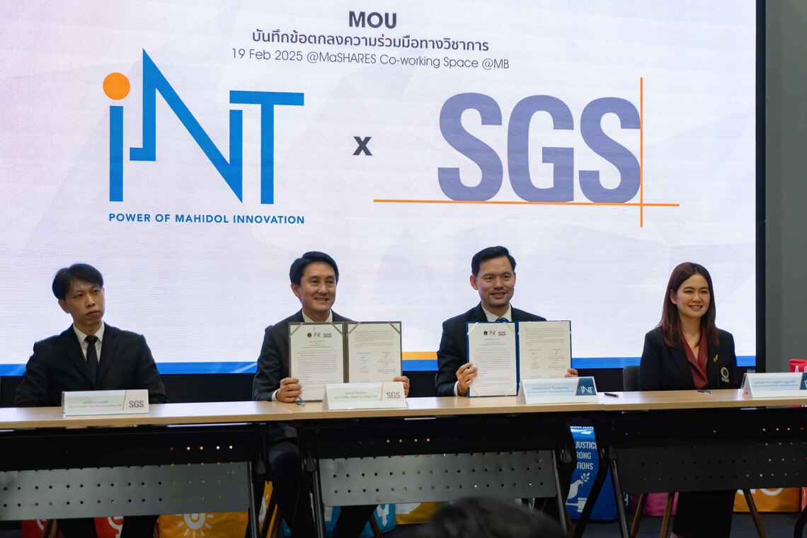 บันทึกข้อตกลงความร่วมมือ (MoU) ระหว่างสถาบันบริหารจัดการเทคโนโลยีและนวัตกรรม (iNT) มหาวิทยาลัยมหิดล และ บริษัท เอสจีเอส (ประเทศไทย) จำกัด ในครั้งนี้ จัดทำขึ้นเพื่อเป็นการสร้างความร่วมมือทางวิชาการระหว่างมหาวิทยาลัยมหิดลกับภาคอุตสาหกรรม พร้อมการต่อยอดในเชิงพาณิชย์ และแลกเปลี่ยนองค์ความรู้ ความเชี่ยวชาญในหลากหลายสาขาให้มีความเชี่ยวชาญและมีศักยภาพในการแข่งขันระดับสูงขึ้น ซึ่งจะช่วยส่งเสริมสนับสนุนงานวิจัยและผลงานนวัตกรรมของมหาวิทยาลัยมหิดลให้เป็นที่ประจักษ์
