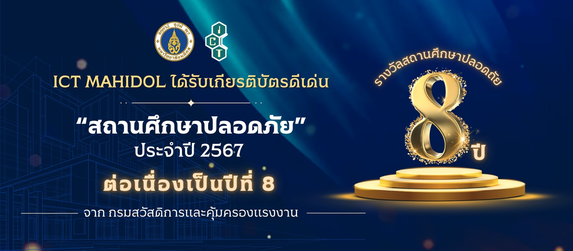 คณะเทคโนโลยีสารสนเทศและการสื่อสาร (ICT) มหาวิทยาลัยมหิดล ได้รับการตรวจประเมินสถานศึกษาตามหลักเกณฑ์มาตรฐานความปลอดภัยจากการเข้าร่วม “กิจกรรมสถานศึกษาปลอดภัย” และได้รับเกียรติบัตรดีเด่น “สถานศึกษาปลอดภัย” ประจำปี 2567 ต่อเนื่องเป็นปีที่ 8 จากกรมสวัสดิการและคุ้มครองแรงงาน เมื่อวันที่ 2 สิงหาคม 2567