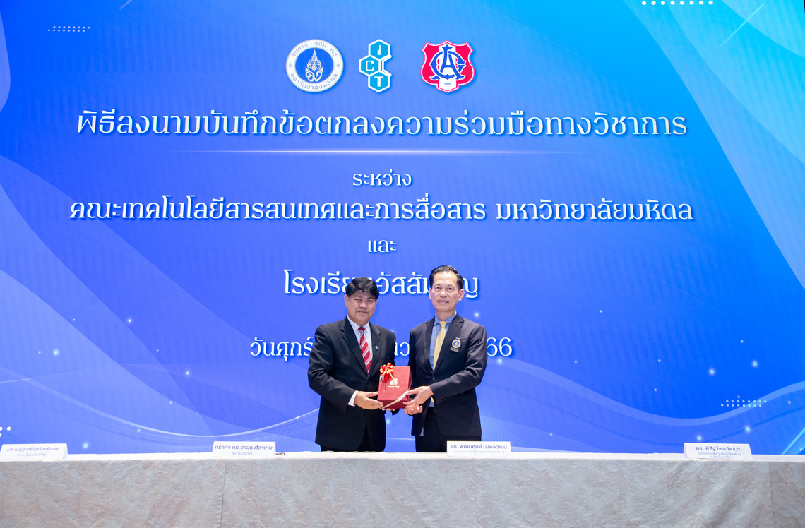 วันที่ 15 ธันวาคม 2566 ดร. พัฒนศักดิ์ มงคลวัฒน์ คณบดี คณะเทคโนโลยีสารสนเทศและการสื่อสาร มหาวิทยาลัยมหิดล (ICT Mahidol) ร่วมลงนามบันทึกข้อตกลงความร่วมมือทางวิชาการ (MoU) กับ ภราดา ดร. อาวุธ ศิลาเกษ ผู้อำนวยการโรงเรียนอัสสัมชัญ โดยมี ดร. พิสิฐ ไพรวัฒนา ผู้ช่วยคณบดีฝ่ายสื่อสารองค์กรและเทคโนโลยีสื่อ และ ดร. ทิพาจินต์ ไทยพิสุทธิกุล ผู้ช่วยคณบดีฝ่ายบริการวิชาการและถ่ายทอดเทคโนโลยี พร้อมด้วย มิสณัฏฐี เจริญเกียรติบวร หัวหน้าฝ่ายวิชาการ ม.ไพฑูรย์ ท้วมกร หัวหน้าฝ่ายโปรแกรมภาษาอังกฤษ และคณาจารย์จากโรงเรียนอัสสัมชัญ ร่วมเป็นสักขีพยาน ณ ห้อง Grand Auditorium ชั้น 4 คณะ ICT มหาวิทยาลัยมหิดล ศาลายา