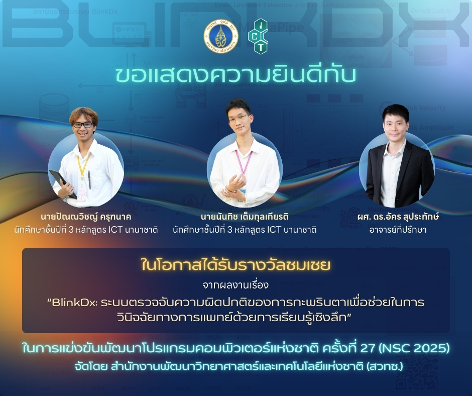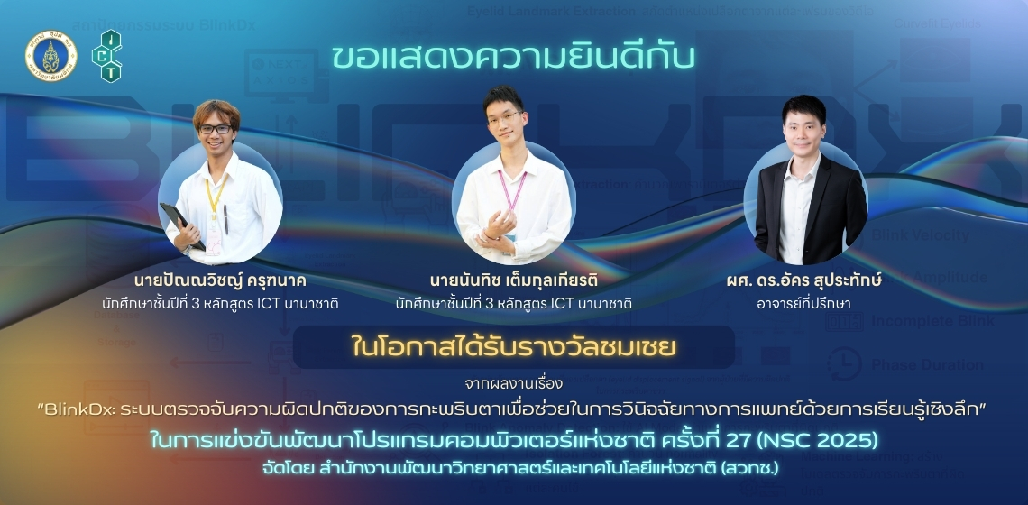 นายปัณณวิชญ์ ครุฑนาค และนายนันทิช เต็มกุลเกียรติ นักศึกษาหลักสูตรวิทยาศาสตรบัณฑิต สาขาวิชาเทคโนโลยีสารสนเทศและการสื่อสาร (ICT หลักสูตรนานาชาติ) ชั้นปีที่ 3 ในโอกาสคว้ารางวัลชมเชย จากการแข่งขันพัฒนาโปรแกรมคอมพิวเตอร์แห่งชาติ ครั้งที่ 27 (The 27th National Software Contest: NSC 2025) หมวดโปรแกรมเพื่อสุขภาพ คนพิการ และผู้สูงอายุ ระดับนิสิต นักศึกษา จากผลงานเรื่อง “BlinkDx: ระบบตรวจจับความผิดปกติของการกะพริบตาเพื่อช่วยในการวินิจฉัยทางการแพทย์ด้วยการเรียนรู้เชิงลึก” โดยมี ผศ.ดร.อัคร สุประทักษ์ เป็นอาจารย์ที่ปรึกษาโครงการ ซึ่งประกาศผลเมื่อวันที่ 25 สิงหาคม 2568