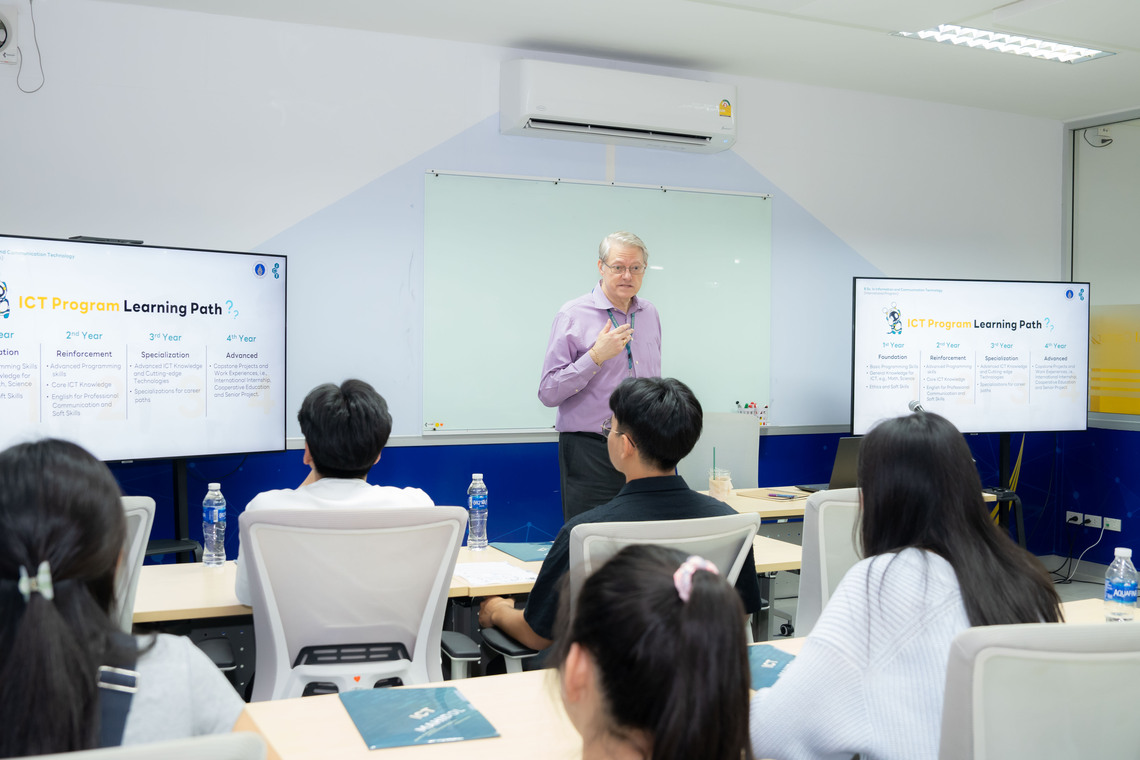 โดยหลังเสร็จสิ้นการเยี่ยมชมคณะฯ Mr. Stephen Edward Smith ยังเป็นผู้แนะนำการเรียนและการสอนในหลักสูตรวิทยาศาสตรบัณฑิต สาขาวิชาเทคโนโลยีสารสนเทศและการสื่อสาร (ICT หลักสูตรนานาชาติ) และภาพรวมของมหาวิทยาลัยมหิดล ให้แก่คณะครูและนักเรียน ณ ห้องประชุม A2 อีกด้วย