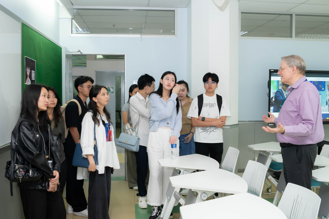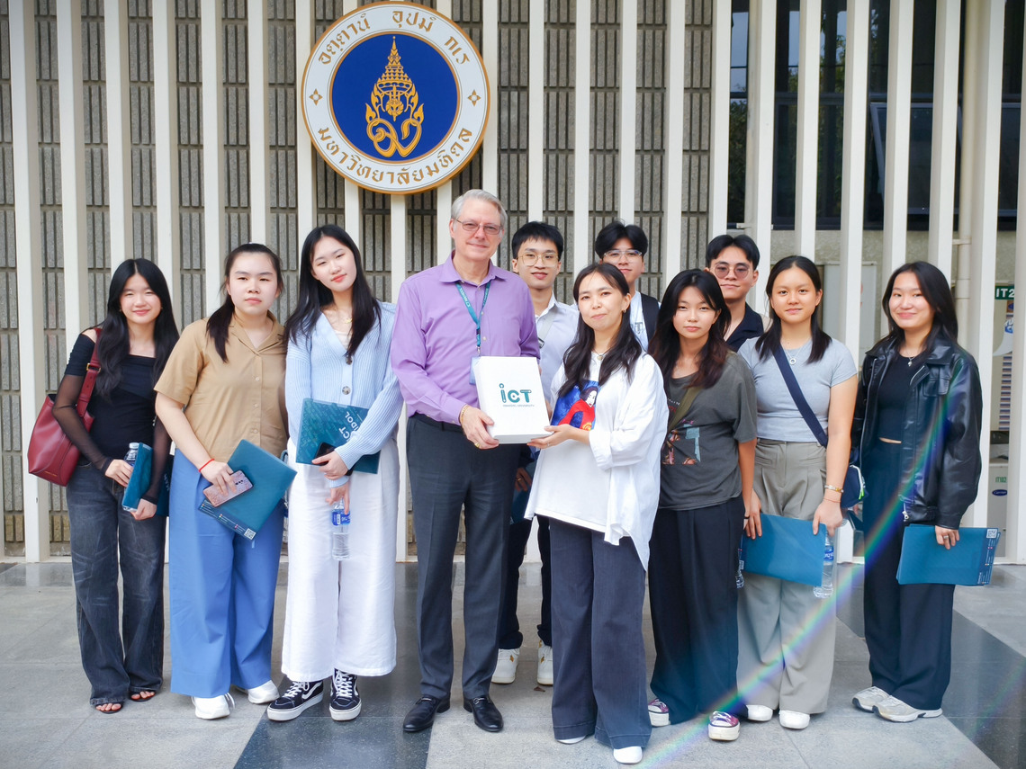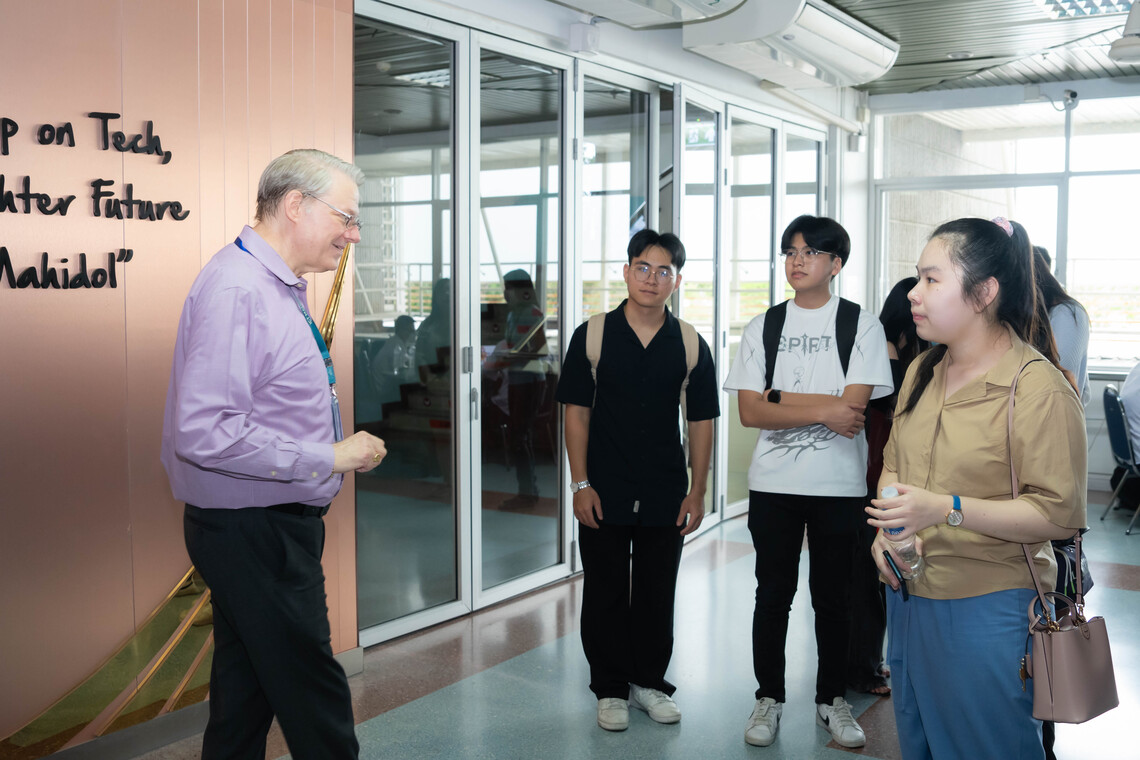 วันที่ 22 พฤศจิกายน 2567 Mr. Stephen Edward Smith, Student and Alumni Engagement และ อาจารย์สอนภาษาอังกฤษ คณะเทคโนโลยีสารสนเทศและการสื่อสาร มหาวิทยาลัยมหิดล (ICT Mahidol) ให้การต้อนรับคณะครูและนักเรียนจาก Paragon International School ราชอาณาจักรกัมพูชา ในโอกาสเข้าเยี่ยมชมคณะฯ และสิ่งอำนวยความสะดวกด้านการเรียนการสอน ได้แก่ ห้องปฏิบัติการ IoT (IoT Lab) ชั้น 1 โดยมี คุณณัฐชาต ธัมกิตติคุณ นักศึกษาหลักสูตรปรัชญาดุษฎีบัณฑิต สาขาวิชาวิทยาการคอมพิวเตอร์ พร้อมด้วย คุณธมกร เจียมรชดา นักวิชาการคอมพิวเตอร์ งานโครงสร้างพื้นฐานเทคโนโลยี เป็นผู้แนะนำห้องปฏิบัติการ Co-working Space ชั้น 2, ห้องเรียน Smart Classroom ชั้น 3, ห้องประชุม Grand Auditorium และห้อง Bits & Bytes Hall ชั้น 4 คณะ ICT มหาวิทยาลัยมหิดล ศาลายา
