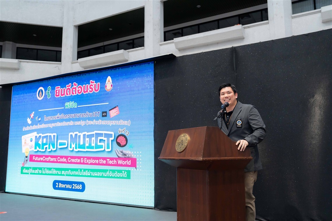 การอบรม “โครงการเพิ่มขีดความสามารถด้าน ICT” เป็นกิจกรรมภายใต้บันทึกข้อตกลงความร่วมมือทางวิชาการ (MoU) ระหว่างคณะ ICT และโรงเรียนกาญจนาภิเษกวิทยาลัย นครปฐม (พระตำหนักสวนกุหลาบมัธยม) มีวัตถุประสงค์เพื่อส่งเสริมและสนับสนุนให้นักเรียนได้รับความรู้ด้านเทคโนโลยีและสารสนเทศในระดับที่สูงขึ้น สามารถนำทักษะ ความรู้และประสบการณ์จากการอบรม ไปต่อยอดองค์ความรู้การเรียนในอนาคตได้ รวมทั้งยังพัฒนากระบวนการคิดให้เป็นระบบยิ่งขึ้น ผ่านการเรียนการสอนในลักษณะ Project Based และ Problem Based ซึ่งกิจกรรมดังกล่าว จัดขึ้นระหว่างวันที่ 19, 26 กรกฎาคม และ 2 สิงหาคม 2568 ณ ห้องปฏิบัติการคอมพิวเตอร์ คณะ ICT โดยมีนักเรียนระดับชั้นมัธยมศึกษาตอนต้นและมัธยมศึกษาตอนปลายเข้าร่วมกิจกรรมจำนวน 82 คน