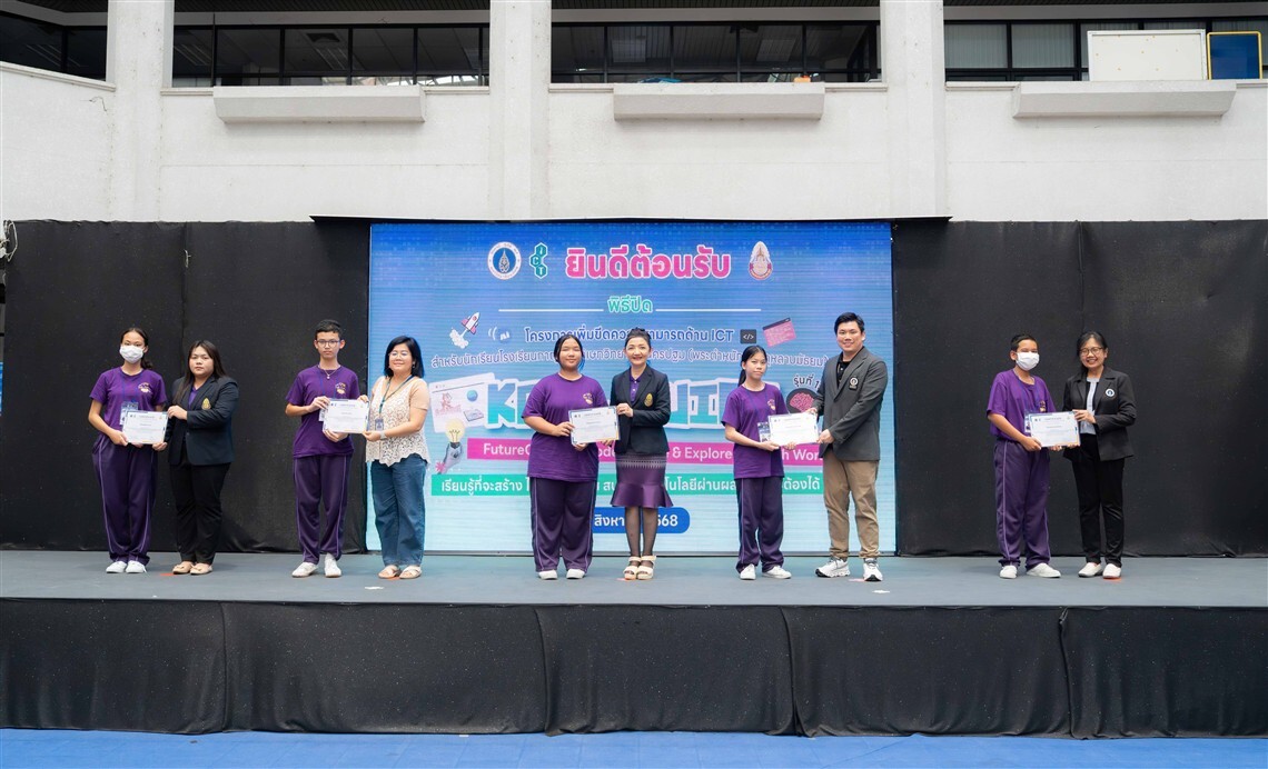 วันที่ 2 สิงหาคม 2568 คณะเทคโนโลยีสารสนเทศและการสื่อสาร มหาวิทยาลัยมหิดล (ICT Mahidol) ร่วมกับโรงเรียนกาญจนาภิเษกวิทยาลัยนครปฐม (พระตำหนักสวนกุหลาบมัธยม) จัดพิธีปิดการอบรม “โครงการเพิ่มขีดความสามารถด้าน ICT สำหรับนักเรียนโรงเรียนกาญจนาภิเษกวิทยาลัย นครปฐม (พระตำหนักสวนกุหลาบมัธยม)” รุ่นที่ 13 ภายใต้ธีม “Future Crafters: Code, Create & Explore the Tech World” โดยได้รับเกียรติจาก ดร.วุฒิชาติ แสวงผล ผู้ช่วยคณบดีฝ่ายวิจัย คณะ ICT และ ดร. กมลชนก ภาคภูมิ หัวหน้ากลุ่มบริหารวิชาการ โรงเรียนกาญจนาภิเษกวิทยาลัย นครปฐม (พระตำหนักสวนกุหลาบมัธยม) เป็นผู้กล่าวปิดการอบรม พร้อมมอบเกียรติบัตรให้แก่นักเรียน ร่วมกับ ดร. ศุจิกา ศรีนันทกุล งานโสตและเทคโนโลยีสื่อการศึกษา และคณะครูโรงเรียนกาญจนาภิเษกวิทยาลัย นครปฐม (พระตำหนักสวนกุหลาบมัธยม) ณ ลาน Innovative Space ชั้น 1 คณะ ICT มหาวิทยาลัยมหิดล ศาลายา