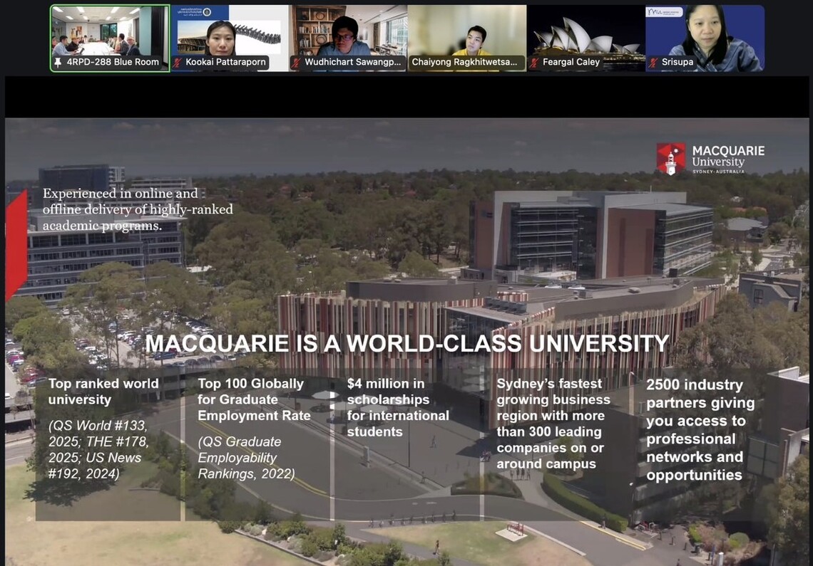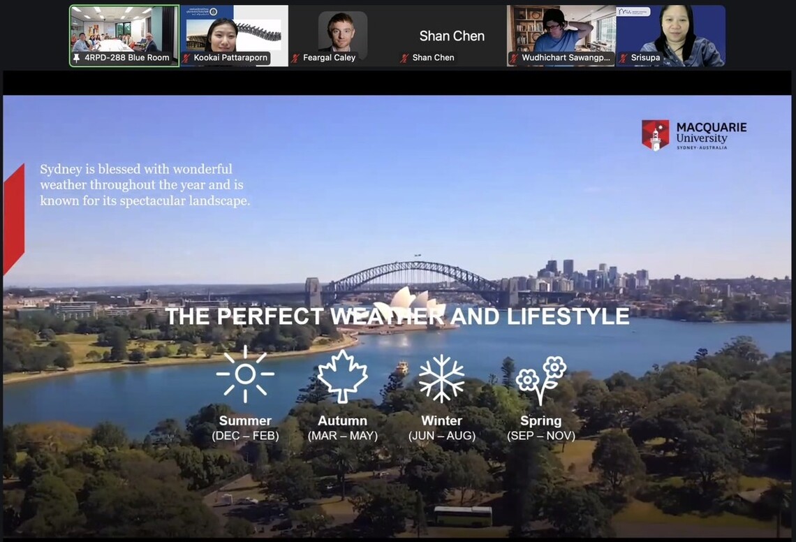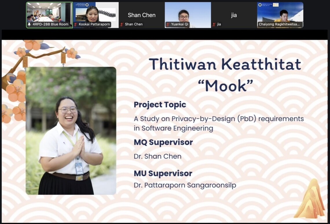 ในโอกาสนี้ ดร.วุฒิชาติ แสวงผล ผู้ช่วยคณบดีฝ่ายวิจัย พร้อมด้วย ผศ. ดร.ธันวดี สุเนตนันท์ ผศ. ดร.ศรีสุภา ปาลกะวงศ์ ณ อยุธยา ผศ. ดร.ชัยยงค์ รักขิตเวชสกุล และ ดร.ภัทรพร แสงอรุณศิลป์ อาจารย์ประจำกลุ่มวิชาวิทยาการคอมพิวเตอร์ และกลุ่มวิจัยวิศวกรรมซอฟต์แวร์และการวิเคราะห์ธุรกิจ (Software Engineering and Business Analytics Research Clusters (SEBA)) ผศ. ดร. ปิยนุช ศิลปโชติ และ ผศ. ดร.ชาญยศ ปลื้มปิติวิริยะเวช อาจารย์ประจำกลุ่มวิชาวิทยาการคอมพิวเตอร์ ยังได้ร่วมแนะนำภาพรวมของคณะ ICT รวมถึงแนะนำกลุ่มนักศึกษาที่เข้าร่วมโครงการฝึกประสบการณ์วิชาชีพด้าน ICT ประจำปีการศึกษา 2567 ในรูปแบบออนไลน์ ผ่านโปรแกรม Zoom พร้อมรับฟังการบรรยายในหัวข้อ Empowering Future Researchers: HDR Programs in the School of Computing โดย Assoc. Prof. Dr. Jia Wu, Associate Professor และ Dr. Young Lee, Senior Lecturer in Computing, School of Computing โดยหลังเสร็จสิ้นการบรรยายพิเศษ คณาจารย์และนักศึกษาของคณะ ICT ยังได้พบกับอาจารย์ที่ปรึกษาจาก Macquarie University