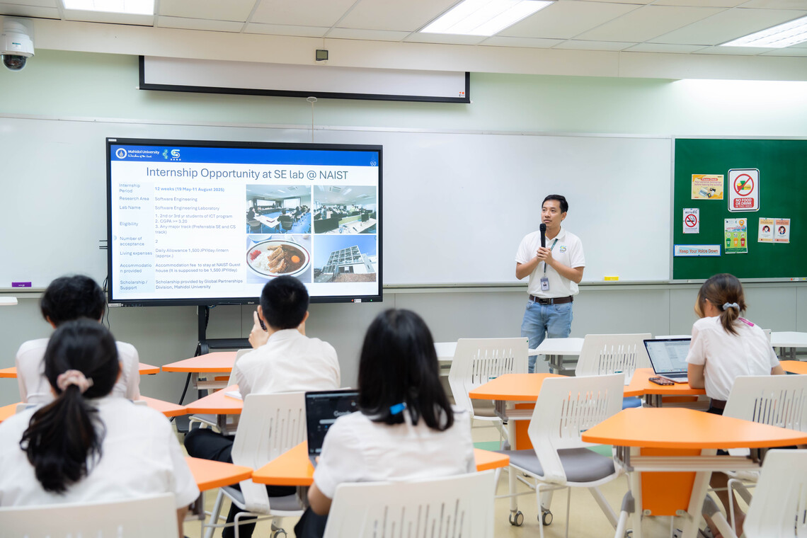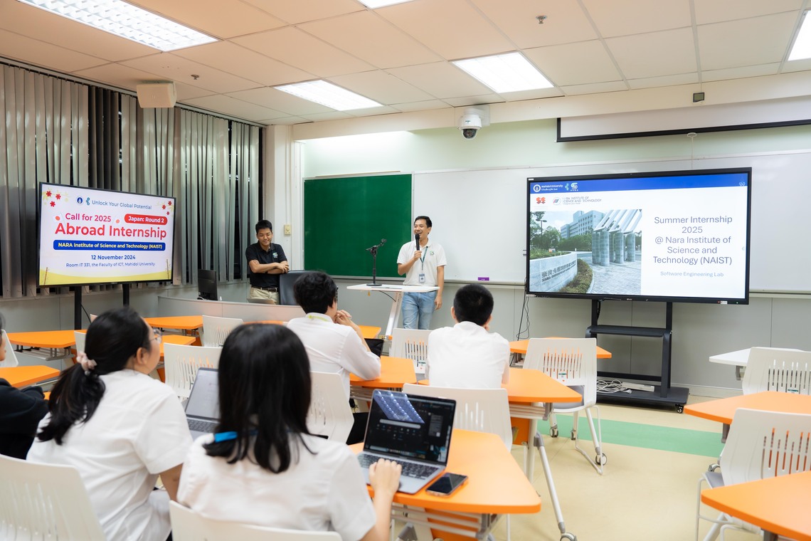 วันที่ 12 พฤศจิกายน 2567 คณะเทคโนโลยีสารสนเทศและการสื่อสาร มหาวิทยาลัยมหิดล (ICT Mahidol) นำโดย ผศ.ดร. มรกต เชิดเกียรติกุล พร้อมด้วย ผศ.ดร. ชัยยงค์ รักขิตเวชสกุล และ ดร. ภัทรพร แสงอรุณศิลป์ อาจารย์ประจำกลุ่มวิชาวิทยาการคอมพิวเตอร์ และกลุ่มวิจัยวิศวกรรมซอฟต์แวร์และการวิเคราะห์ธุรกิจ (Software Engineering and Business Analytics Research Clusters (SEBA)) จัดกิจกรรม “Information Session: Abroad Internship, Japan (Round 2: NAIST)” เพื่อแนะนำข้อมูลโครงการแลกเปลี่ยน ณ NARA Institute of Science and Technology (NAIST) ประเทศญี่ปุ่น และภาพรวมของการฝึกงานด้าน ICT พร้อมชี้แจงรายละเอียดเกี่ยวกับเกณฑ์การสมัคร ให้แก่นักศึกษาหลักสูตรวิทยาศาสตรบัณฑิต สาขาวิชาเทคโนโลยีสารสนเทศและการสื่อสาร (ICT หลักสูตรนานาชาติ) จำนวน 21 คน ณ ห้อง IT331 ชั้น 3 คณะ ICT มหาวิทยาลัยมหิดล ศาลายา