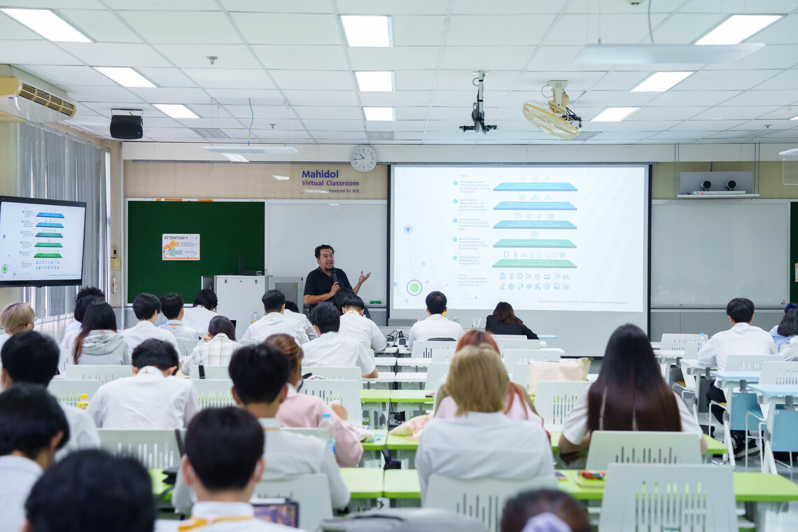 วันที่ 25 มีนาคม 2567 คณะเทคโนโลยีสารสนเทศและการสื่อสาร มหาวิทยาลัยมหิดล (ICT Mahidol) นำโดย ผู้ช่วยศาสตราจารย์ ดร. ฐิตินันท์ ตันติธรรม และ ดร. ชัยยงค์ รักขิตเวชสกุล อาจารย์ประจำรายวิชา ทสวด 101 โจทย์และประสบการณ์ทางอุตสาหกรรม 1 (ITDS101 Industry Problems and Experiences 1) จัดบรรยายพิเศษในหัวข้อ “ธุรกิจ และองค์ความรู้ ที่ต้องใช้ IoT” โดยได้รับเกียรติจาก คุณทศพร เวชศิริ ประธานเจ้าหน้าที่บริหาร บริษัท โลจิเซ้นส์ จำกัด และนายกสมาคมเมกเกอร์ประเทศไทย เป็นวิทยากรถ่ายทอดความรู้เกี่ยวกับ Internet of Things (IoT) และการนำองค์ความรู้ของ IoT มาประยุกต์ใช้ในการประกอบธุรกิจ ณ ปัจจุบัน ให้แก่นักศึกษาชั้นปีที่ 1 หลักสูตรวิทยาศาสตรบัณฑิต สาขาวิชาวิทยาการและเทคโนโลยีดิจิทัล (DST หลักสูตรไทย) ณ ห้อง IT204 ชั้น 2 คณะ ICT มหาวิทยาลัยมหิดล ศาลายา