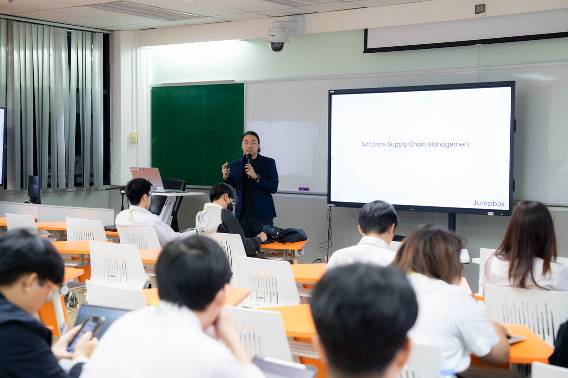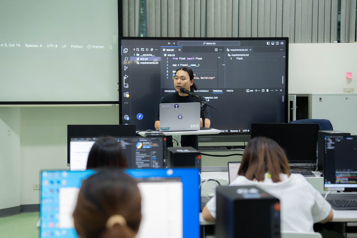 วันที่ 13 พฤศจิกายน 2567 คณะเทคโนโลยีสารสนเทศและการสื่อสาร มหาวิทยาลัยมหิดล (ICT Mahidol) นำโดย ดร.อิทธิพล รัศมีโรจน์ ผู้ช่วยคณบดีฝ่ายโครงสร้างพื้นฐานและเทคโนโลยี ซึ่งเป็นอาจารย์ประจำรายวิชา ทสวด 323 การพัฒนาระบบเชิงปฏิบัติการและการประยุกต์ (ITDS323 Practical DevOps and Applications) จัดบรรยายพิเศษในหัวข้อ “DevSecOps” โดยได้รับเกียรติจาก คุณสฤษรัตน์ จิรกุลพรชัย CTO & Co-Founder บริษัท จัมป์บ็อกซ์ จำกัด เป็นวิทยากรถ่ายทอดความรู้เกี่ยวกับ DevSecOps ซึ่งเป็นการรวมกระบวนการรักษาความปลอดภัย เข้าไปในทุกขั้นตอนของการพัฒนาและการดำเนินงานของระบบซอฟต์แวร์ ตั้งแต่การออกแบบ การพัฒนา การทดสอบ ไปจนถึงการนำขึ้นใช้งานจริง เพื่อลดความเสี่ยงและป้องกันภัยคุกคามทางไซเบอร์ตั้งแต่แรกเริ่มของวงจรการพัฒนา โดยเน้นการทำงานร่วมกันระหว่างทีมพัฒนา (Developers) ทีมรักษาความปลอดภัย (Security) และทีมปฏิบัติการ (Operations) ให้แก่นักศึกษาชั้นปีที่ 3 หลักสูตรวิทยาศาสตรบัณฑิต สาขาวิชาวิทยาการและเทคโนโลยีดิจิทัล (DST หลักสูตรไทย) ณ ห้องปฏิบัติการคอมพิวเตอร์ IT104 ชั้น 1 และ ห้อง IT331 ชั้น 3 คณะ ICT มหาวิทยาลัยมหิดล ศาลายา