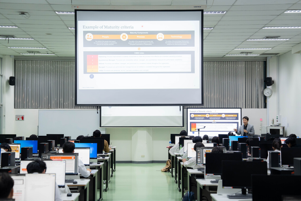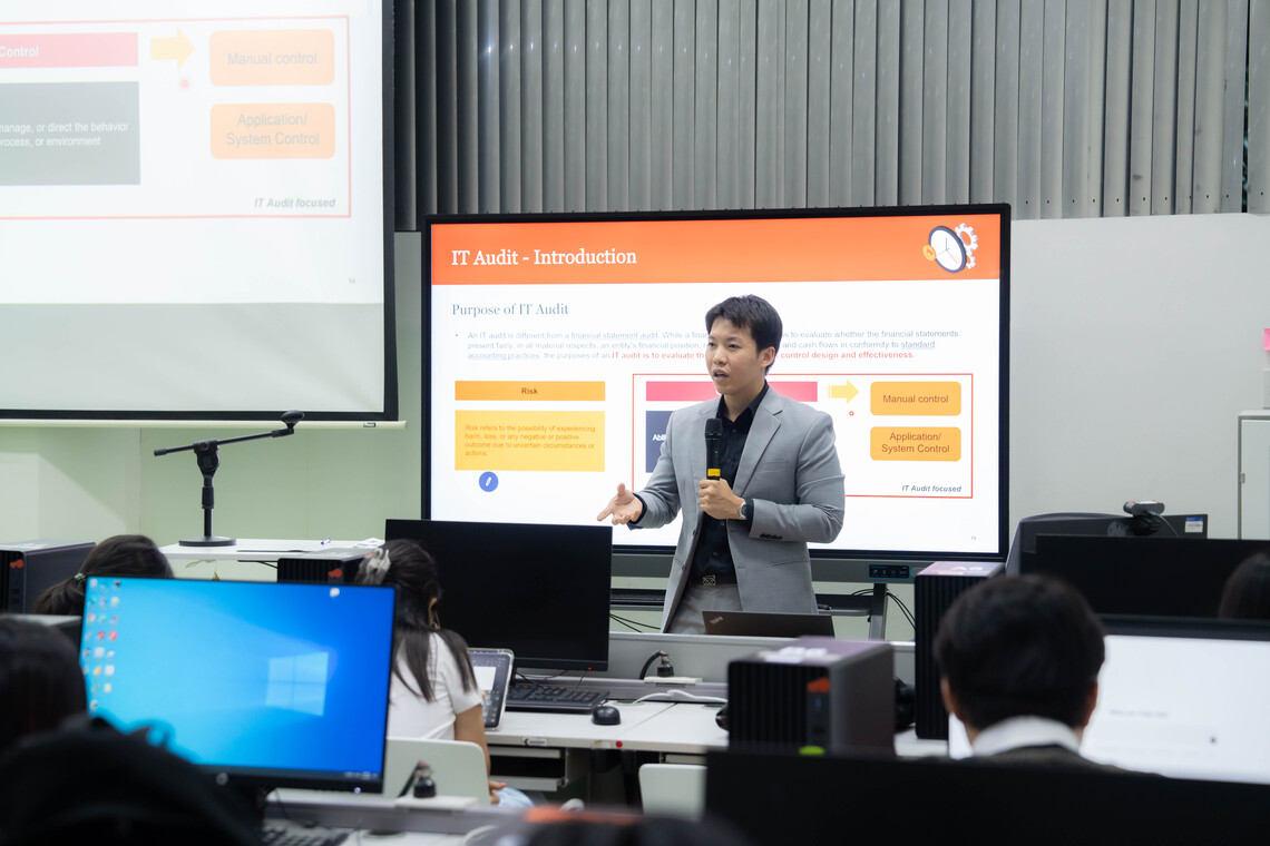 วันที่ 14 มกราคม 2568 คณะเทคโนโลยีสารสนเทศและการสื่อสาร มหาวิทยาลัยมหิดล (ICT Mahidol) นำโดย ดร.อัษฎารัตน์ คูรัตน์ ผู้ช่วยคณบดีฝ่ายการจัดการความเสี่ยงและความมั่นคงทางไซเบอร์ ซึ่งเป็นอาจารย์ประจำรายวิชา ทสวด355 การตรวจสอบด้านเทคโนโลยีสารสนเทศ (ITDS355 IT Auditing) จัดบรรยายพิเศษในหัวข้อ “IT Audit in Practices” โดยได้รับเกียรติจากคุณธนภัทร วัชรีวงศ์ ณ อยุธยา Risk Assurance Manager บริษัท ไพร้ซวอเตอร์เฮาส์คูเปอร์ส คอนซัลติ้ง (ประเทศไทย) จำกัด ซึ่งเป็นศิษย์เก่า หลักสูตรวิทยาศาสตรมหาบัณฑิต สาขาวิชาความมั่นคงไซเบอร์และการประกันสารสนเทศ เป็นวิทยากรถ่ายทอดความรู้เกี่ยวกับการตรวจสอบเทคโนโลยีสารสนเทศ (IT Audit) ในมุมมองการปฏิบัติจริง โดยมุ่งเน้นไปที่การนำความรู้ ทฤษฎี และมาตรฐานการตรวจสอบ IT ไปใช้ในสถานการณ์จริงในองค์กรหรือธุรกิจต่างๆให้แก่นักศึกษาหลักสูตรวิทยาศาสตรบัณฑิต สาขาวิชาวิทยาการและเทคโนโลยีดิจิทัล (DST หลักสูตรไทย) ชั้นปีที่ 3 ณ ห้องปฏิบัติการคอมพิวเตอร์ 103 ชั้น 1 คณะ ICT มหาวิทยาลัยมหิดล ศาลายา