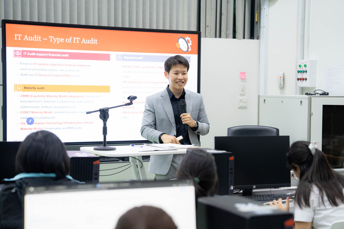 วันที่ 14 มกราคม 2568 คณะเทคโนโลยีสารสนเทศและการสื่อสาร มหาวิทยาลัยมหิดล (ICT Mahidol) นำโดย ดร.อัษฎารัตน์ คูรัตน์ ผู้ช่วยคณบดีฝ่ายการจัดการความเสี่ยงและความมั่นคงทางไซเบอร์ ซึ่งเป็นอาจารย์ประจำรายวิชา ทสวด355 การตรวจสอบด้านเทคโนโลยีสารสนเทศ (ITDS355 IT Auditing) จัดบรรยายพิเศษในหัวข้อ “IT Audit in Practices” โดยได้รับเกียรติจากคุณธนภัทร วัชรีวงศ์ ณ อยุธยา Risk Assurance Manager บริษัท ไพร้ซวอเตอร์เฮาส์คูเปอร์ส คอนซัลติ้ง (ประเทศไทย) จำกัด ซึ่งเป็นศิษย์เก่า หลักสูตรวิทยาศาสตรมหาบัณฑิต สาขาวิชาความมั่นคงไซเบอร์และการประกันสารสนเทศ เป็นวิทยากรถ่ายทอดความรู้เกี่ยวกับการตรวจสอบเทคโนโลยีสารสนเทศ (IT Audit) ในมุมมองการปฏิบัติจริง โดยมุ่งเน้นไปที่การนำความรู้ ทฤษฎี และมาตรฐานการตรวจสอบ IT ไปใช้ในสถานการณ์จริงในองค์กรหรือธุรกิจต่างๆให้แก่นักศึกษาหลักสูตรวิทยาศาสตรบัณฑิต สาขาวิชาวิทยาการและเทคโนโลยีดิจิทัล (DST หลักสูตรไทย) ชั้นปีที่ 3 ณ ห้องปฏิบัติการคอมพิวเตอร์ 103 ชั้น 1 คณะ ICT มหาวิทยาลัยมหิดล ศาลายา