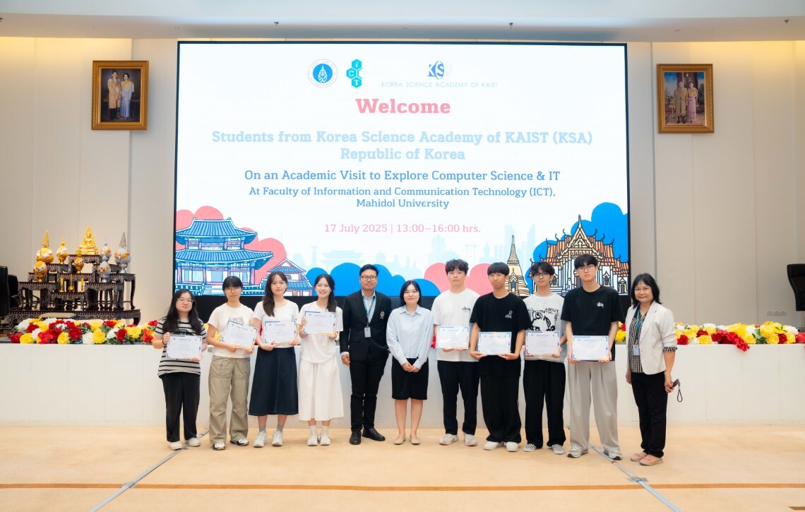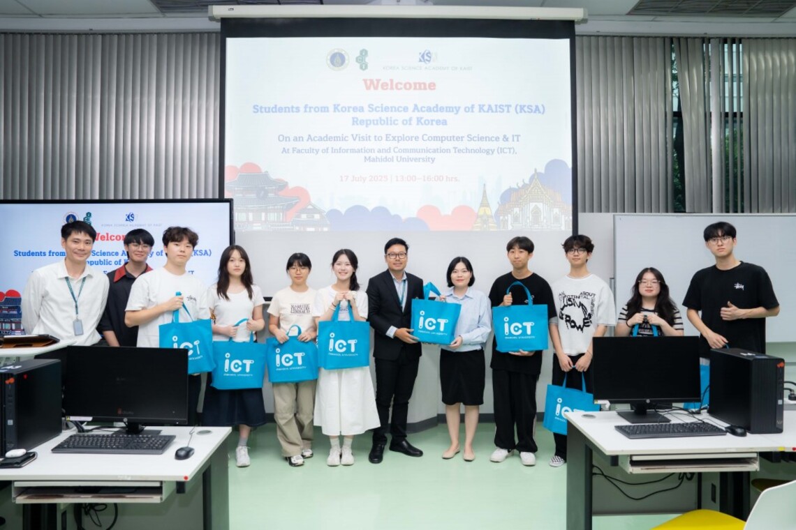 วันที่ 17 กรกฎาคม 2568 คณะเทคโนโลยีสารสนเทศและการสื่อสาร มหาวิทยาลัยมหิดล (ICT Mahidol) ให้การต้อนรับนักเรียนจากโรงเรียน Korea Science Academy of KAIST (KSA) สาธารณรัฐเกาหลี ในโอกาสเข้าเยี่ยมชมและศึกษาดูงานทางด้านเทคโนโลยีสารสนเทศ โดยได้รับเกียรติจาก รศ.ดร.ศุภวงศ์ ทั่วรอบ อาจารย์ประจำกลุ่มวิชาวิทยาการคอมพิวเตอร์ และหัวหน้ากลุ่มวิจัย Machine Intelligence and Knowledge Engineering (MIKE) ในฐานะผู้แทนคณบดี กล่าวต้อนรับนักเรียนที่เข้าร่วมกิจกรรม โดยมี ผศ.ดร.อัคร สุประทักษ์ อาจารย์ประจำกลุ่มวิชาวิทยาการคอมพิวเตอร์ เป็นวิทยากรบรรยายให้ความรู้และฝึกปฏิบัติในหัวข้อ “PostNext Playground: Build Your Own AI Automation” และนายภูริวัจน์ อังกูรดิษฐพงศ์ ศิษย์เก่า ICT รุ่น 18 เป็นผู้ช่วยวิทยากร ณ ห้อง LAB 105 คณะ ICT มหาวิทยาลัยมหิดล ศาลายา